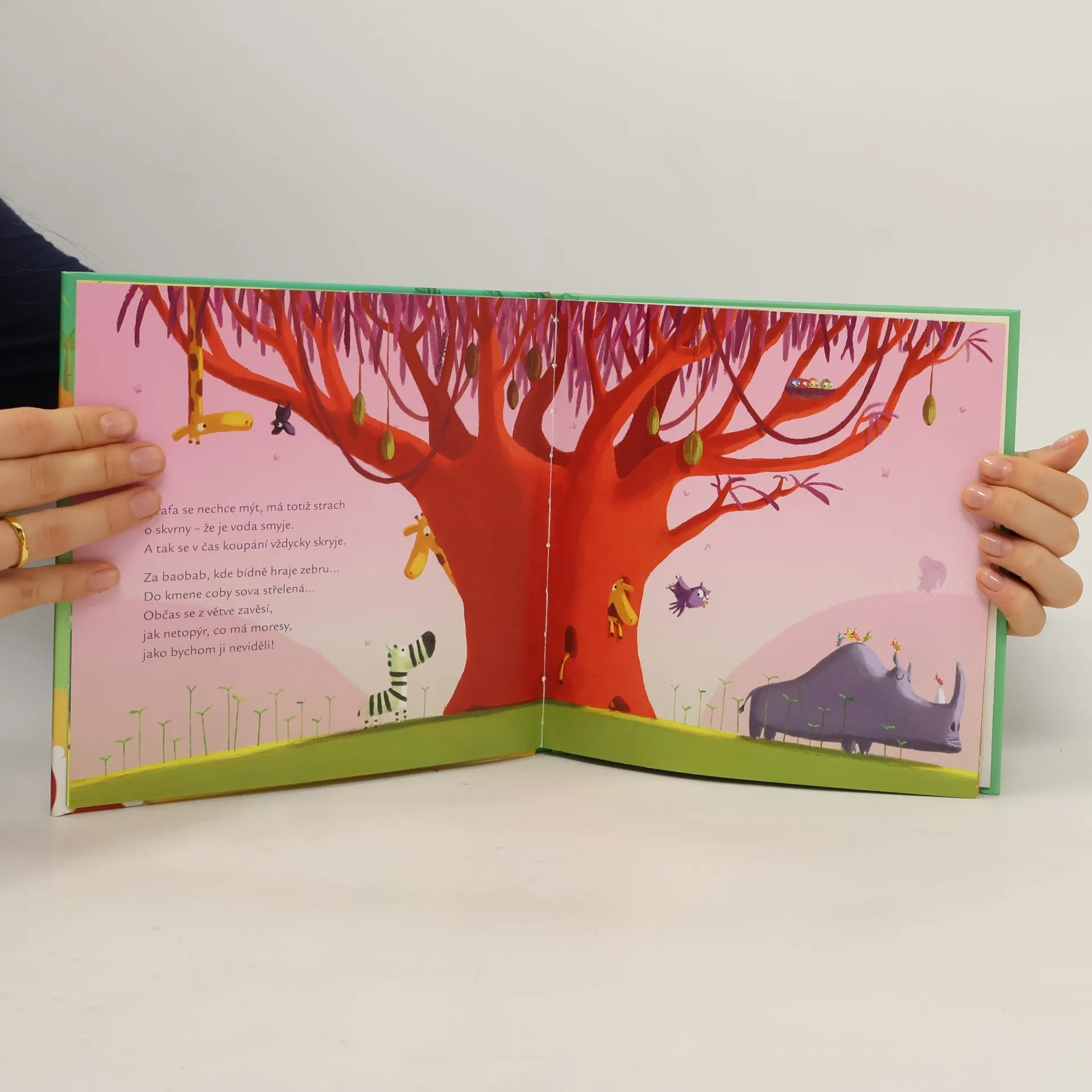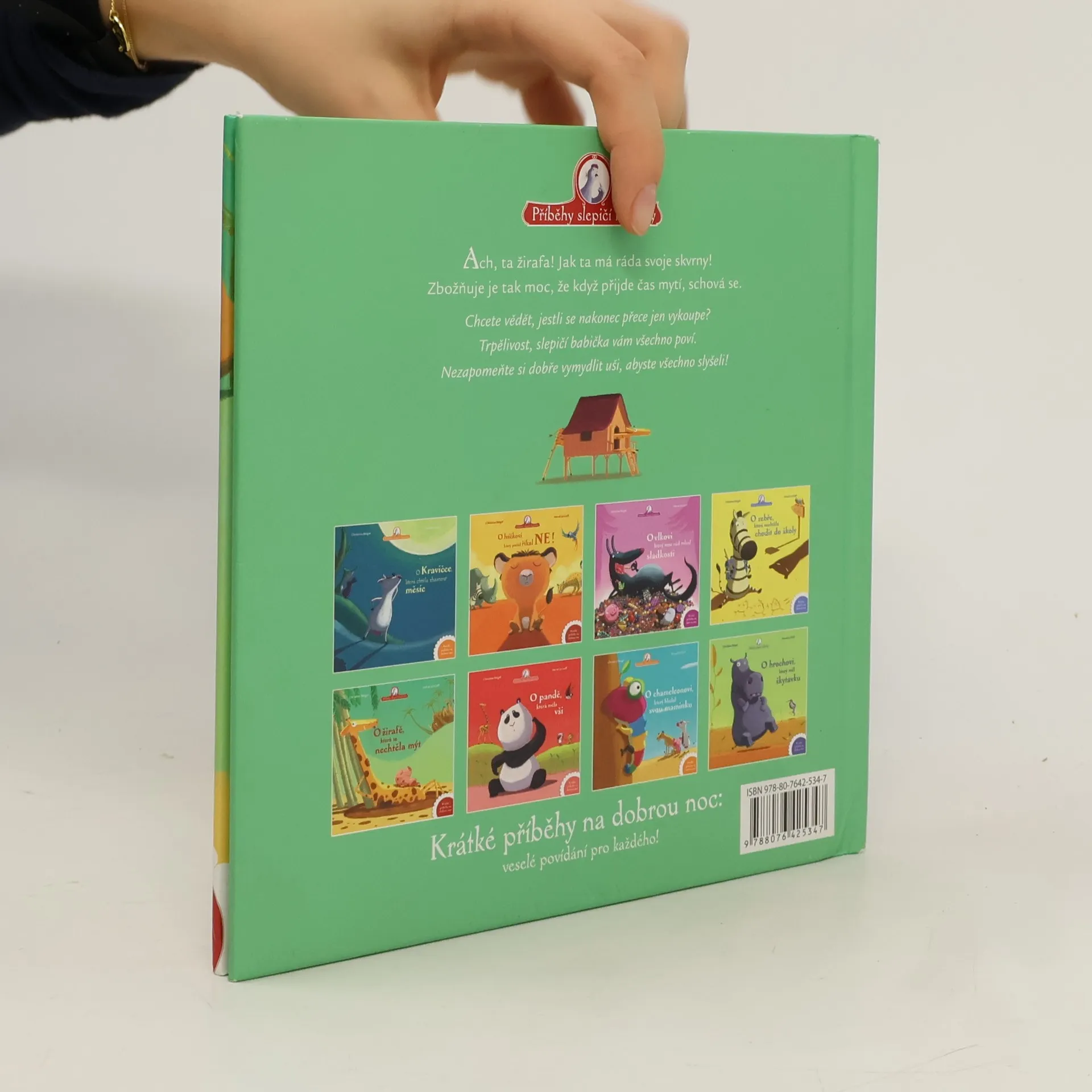 Podívejte, žirafa! Jak ta má ráda svoje skvrny! Zbožňuje je tak moc, že když přijde čas mytí, schová se. Chcete vědět, jestli se nakonec přece jen vykoupe? Trpělivost, slepičí babička vám všechno poví. Nezapomeňte si dobře vymydlit uši, abyste všechno slyšeli!