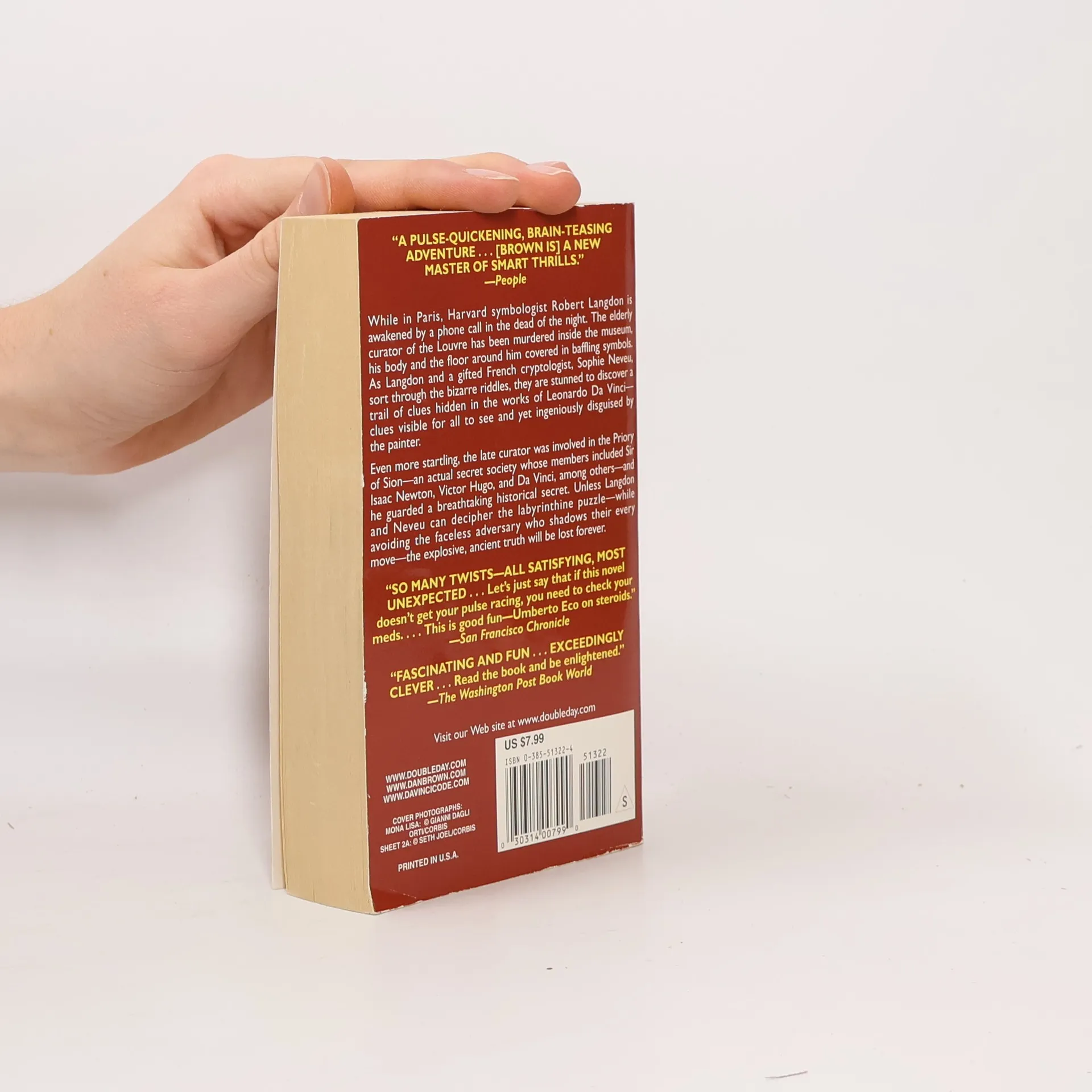 While in Paris, Harvard symbologist Robert Langdon is awakened by a phone call in the dead of the night. The elderly curator of the Louvre has been murdered inside the museum, his body and the floor around him covered in baffling symbols. As Langdon and a gifted French cryptologist, Sophie Neveu, sort through the bizarre riddles, they are stunned to discover a trail of clues hidden in the works of Leonardo Da Vinci -- clues visible for all to see and yet ingeniously disguised by the painter. Even more startling, the late curator was involved in the Priory of Sion -- an actual secret society whose members included Sir Isaac Newton, Victor Hugo, and Da Vinci, among others -- and he guarded a breathtaking historical secret. Unless Langdon and Neveu can decipher the labyrinthine puzzle -- while avoiding the faceless adversary who shadows their every move -- the explosive, ancient truth will be lost forever. (back cover)