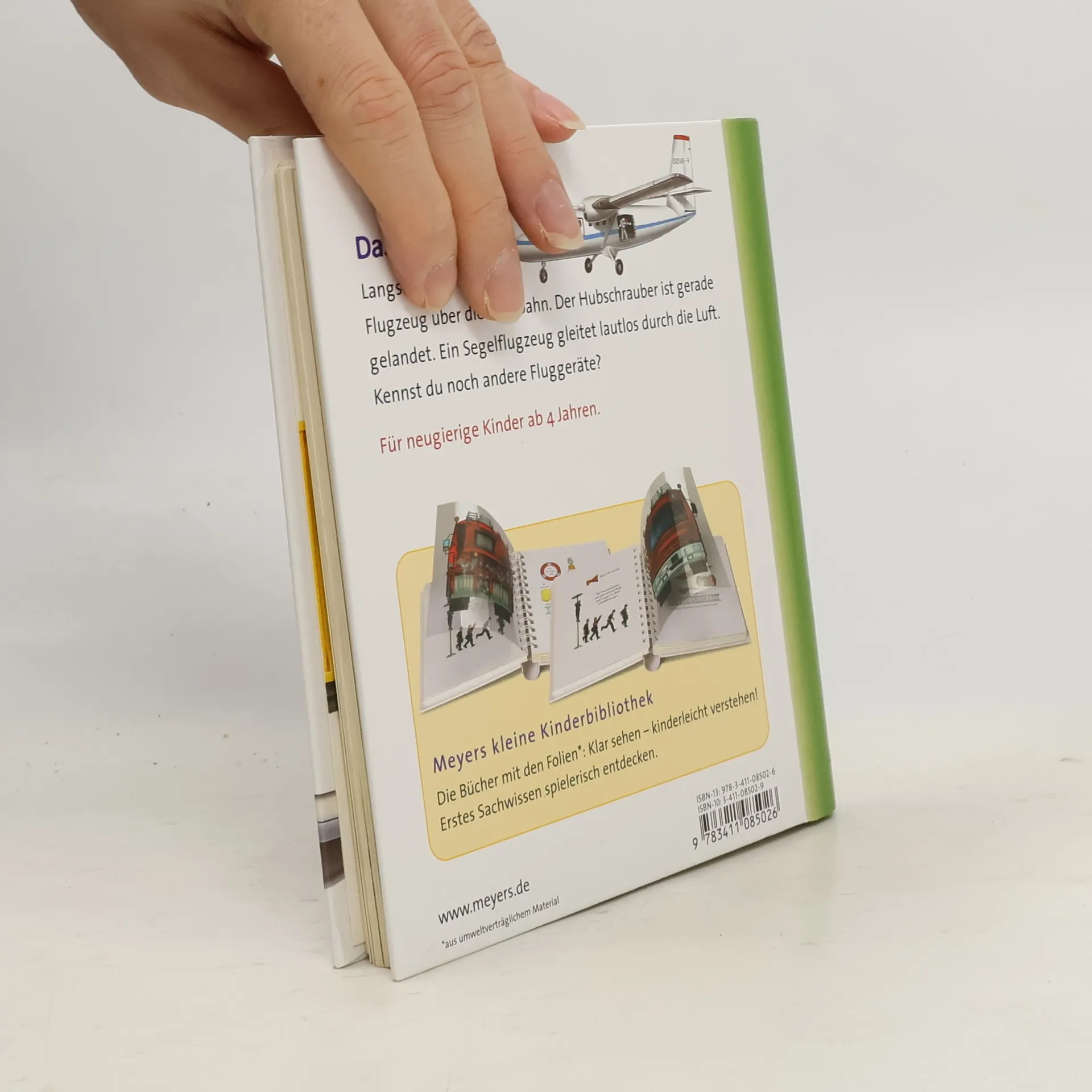 Durch spannende Effekte vermittelt die Bilderbuchreihe „Meyers kleine Kinderbibliothek“ erstes Sachwissen für Kinder ab 3 Jahren. Transparente Folien zeigen beim Umblättern das Innenleben von Dingen, machen Verdecktes sichtbar oder veranschaulichen Veränderungen. Der Band „Das Flugzeug“ erzählt den Kleinen anhand zahlreicher Abbildungen allerlei den Traum vom Fliegen, über das Cockpit eines Flugzeugs und über andere Fluggeräte, wie den Ballon, den Hubschrauber oder den Segelflieger.