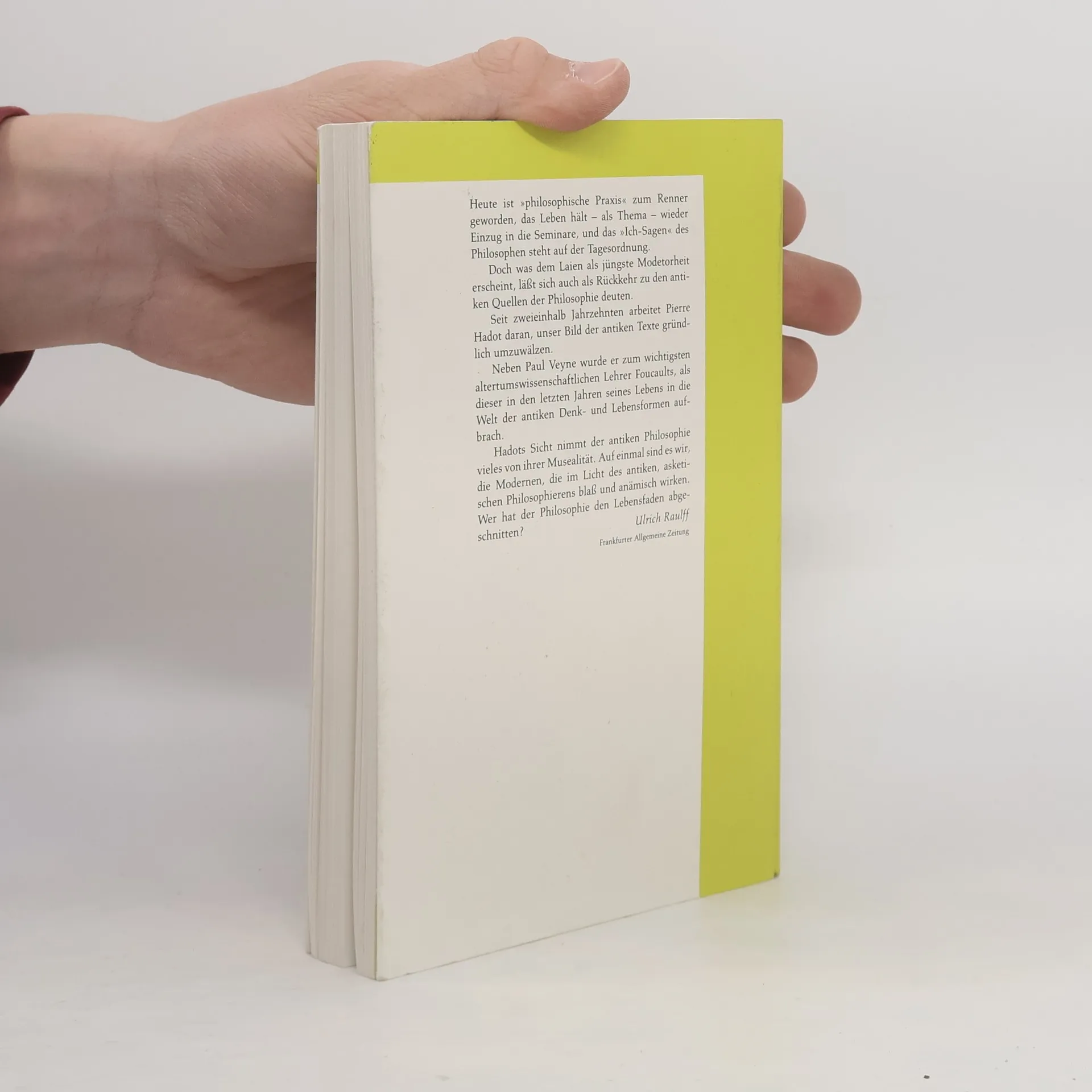 Bevor Philosophie eine Sache von Spezialisten und in Reaktion darauf von Kinderbuchautoren wurde, war sie der Formung einer freien Existenz verpflichtet. Pierre Hadot verfolgt diese Tradition von den antiken Ursprüngen über Kierkegaard und Nietzsche bis hin zu Michel Foucault, dessen Auseinandersetzung mit der antiken Philosophie Hadots Schriften und Vorlesungen viel verdankt.