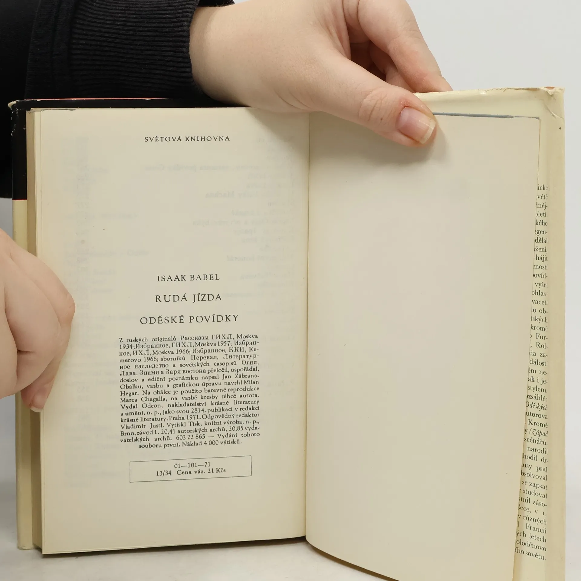 Svazek obsahuje celé Babelovo dochované prozaické dílo, jež patří ke klasice sovětské literatury a zároveň k významným hodnotám světové prózy dvacátého století, tj. povídkový cyklus o polském tažení v roce 1920 Rudá jízda,Oděské povídky, a to v prvním cyklu s legendárním hrdinou přístavního podsvětí Beňou Krikem a ve druhém pojatém jako vzpomínky na dětství, dále zbývající, za autorova života většinou knižně netištěné povídky pod názvem povídky. Svazek doplňuje pod názvem Vzpomínky autorovo vzpomínání na setkání s Gorkým a charakterizující črta o Bagrickém. "Základním Babelovým tématem, které prochází celou jeho tvorbou a spojuje všechny její části" říká se v doslovu , "je protest proti násilí starého světa - a válka je jeho nejvyhraněnější formou násilí, které deformuje a odlidšťuje osobnost člověka."