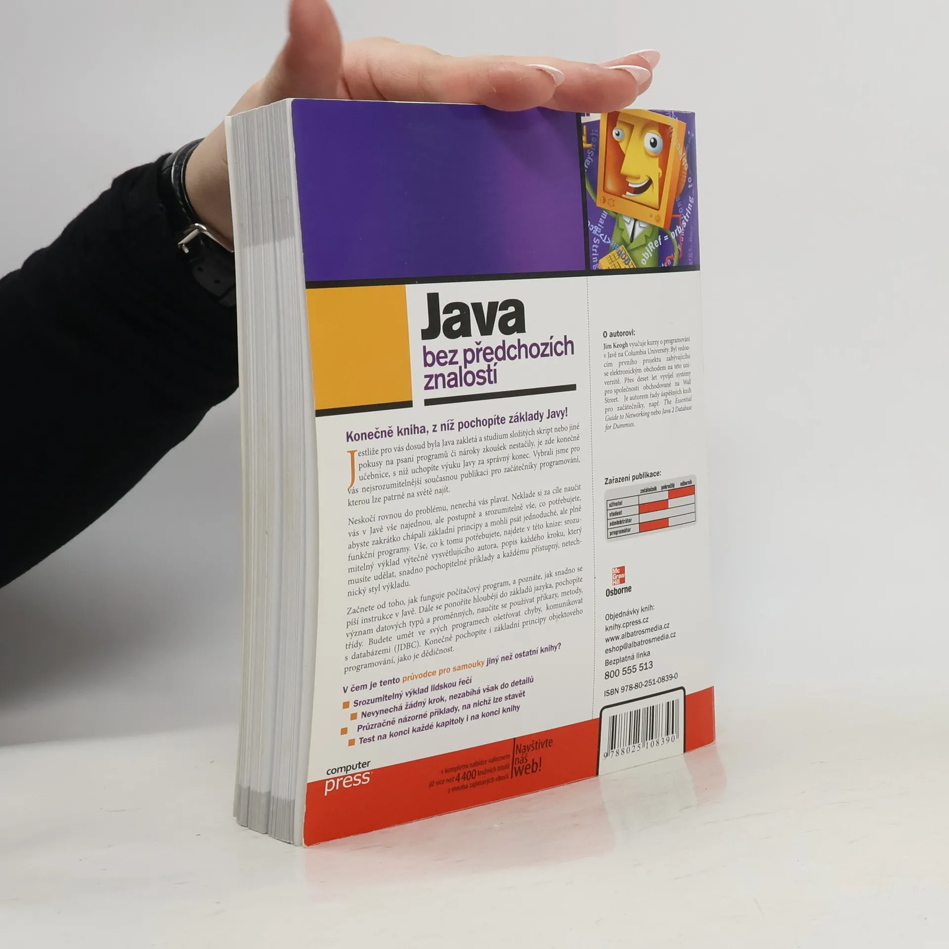 Konečně je zde kniha, s níž porozumíte Javě! Bez obvyklého odborného slangu, na množství jednoduchých příkladů, s kontrolními otázkami na koncích kapitol a se závěrečným testem sami a v krátké době zvládnete základy Javy: stavbu programů, výrazy a příkazy, ošetření výjimek a JDBC, zvládnete zkrátka vytváření fungujících programů v Javě!