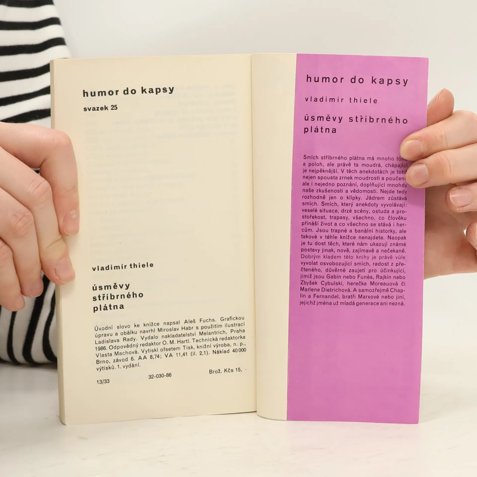 Tato knížka je věnována mixáži z úsměvů filmových hvězd a humoru stříbrného plátna.Uvedené historky jsou možná ze dvou třetin smyšlené, ale v každém případě jsou vymyšleny dobře- a není to jen pro pamětníky. 32-030-86