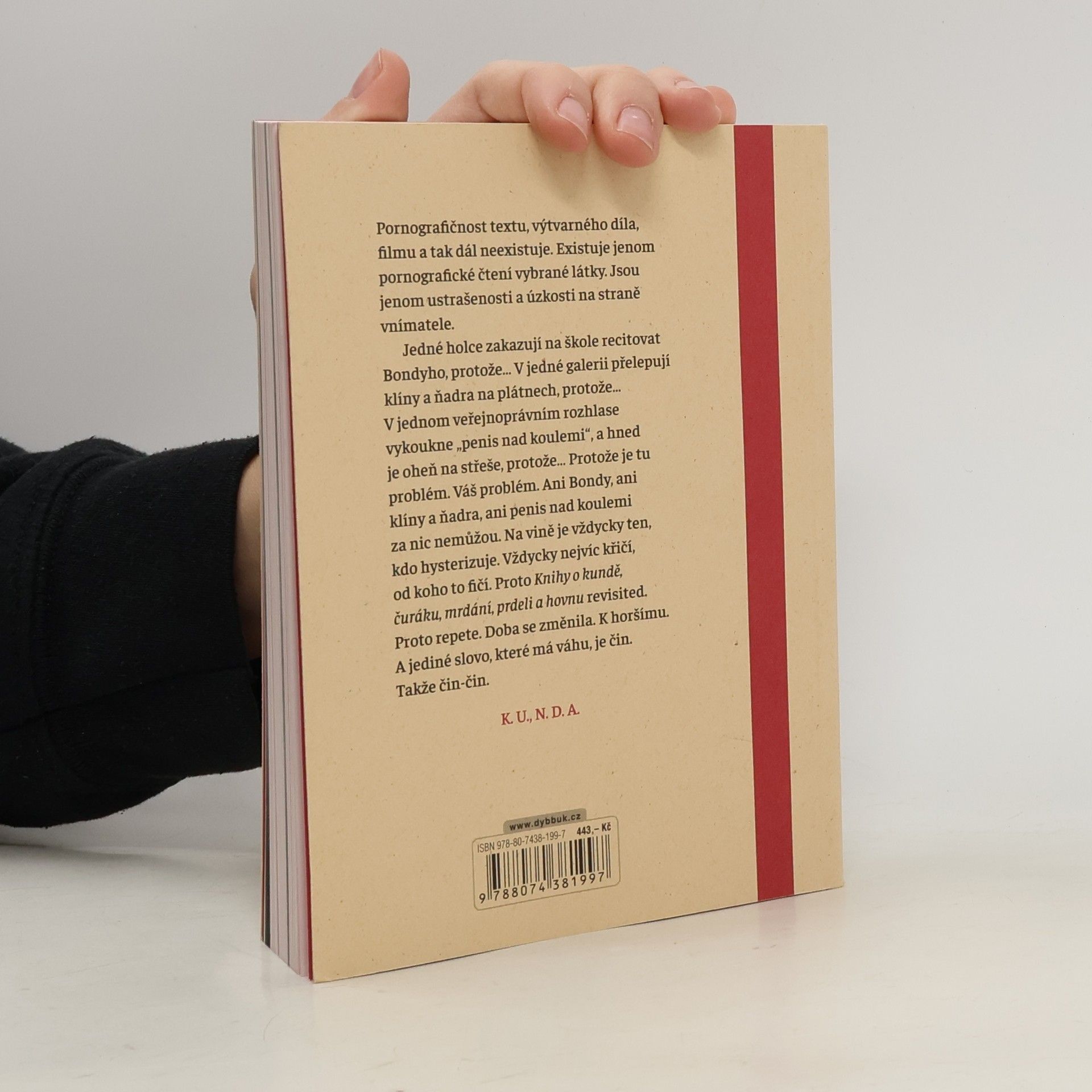 „KNIHA O“ je sbírka více než tří set erotických textů z pera spisovatelů uznávaných, zatracovaných i anonymních, bohatě ilustrovaná výtvarníky napříč staletími. Navazuje na kontroverzní Knihu o kundě a rozšiřuje ji o další texty i díla současných českých umělců. Ať už v literatuře či v umění, erotika je nevysychající pramen fantazie a života… Kunda je cesta, po které sem člověk přišel a ke které se celý život vrací. Když penis stojí, je připraven, a když je připraven, je to neslušnost. I v dnešní době existují tabu, přičemž život ze samotné své povahy přestupuje veškerá omezení… „Pornografičnost textu, výtvarného díla, filmu a tak dál neexistuje. Existuje jenom pornografické čtení vybrané látky. Jsou jenom ustrašenosti a úzkosti na straně vnímatele. Jedné holce zakazují na škole recitovat Bondyho, protože… V jedné galerii přelepují klíny a ňadra na plátnech, protože… V jednom veřejnoprávním rozhlase vykoukne „penis nad koulemi“, a hned je oheň na střeše, protože… Protože je tu problém. Váš problém. Ani Bondy, ani klíny a ňadra, ani penis nad koulemi za nic nemůžou. Na vině je vždycky ten, kdo hysterizuje. Vždycky nejvíc křičí, od koho to fičí. Proto repete. Doba se změnila. K horšímu. A jediné slovo, které má váhu, je čin. Takže čin-čin.“
