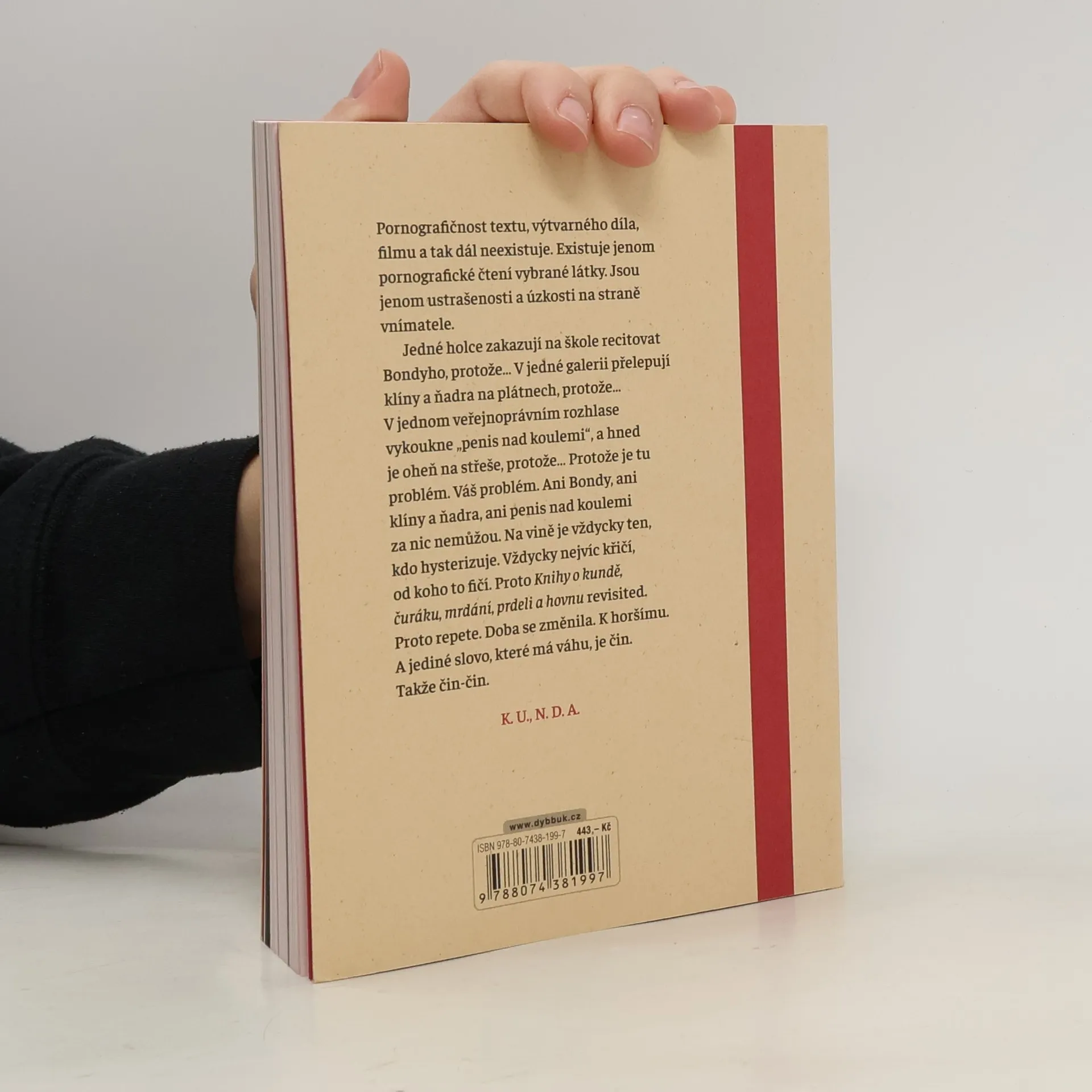 „KNIHA O“ je sbírka více než tří set erotických textů z pera spisovatelů uznávaných, zatracovaných i anonymních, bohatě ilustrovaná výtvarníky napříč staletími. Navazuje na kontroverzní Knihu o kundě a rozšiřuje ji o další texty i díla současných českých umělců. Ať už v literatuře či v umění, erotika je nevysychající pramen fantazie a života… Kunda je cesta, po které sem člověk přišel a ke které se celý život vrací. Když penis stojí, je připraven, a když je připraven, je to neslušnost. I v dnešní době existují tabu, přičemž život ze samotné své povahy přestupuje veškerá omezení… „Pornografičnost textu, výtvarného díla, filmu a tak dál neexistuje. Existuje jenom pornografické čtení vybrané látky. Jsou jenom ustrašenosti a úzkosti na straně vnímatele. Jedné holce zakazují na škole recitovat Bondyho, protože… V jedné galerii přelepují klíny a ňadra na plátnech, protože… V jednom veřejnoprávním rozhlase vykoukne „penis nad koulemi“, a hned je oheň na střeše, protože… Protože je tu problém. Váš problém. Ani Bondy, ani klíny a ňadra, ani penis nad koulemi za nic nemůžou. Na vině je vždycky ten, kdo hysterizuje. Vždycky nejvíc křičí, od koho to fičí. Proto repete. Doba se změnila. K horšímu. A jediné slovo, které má váhu, je čin. Takže čin-čin.“