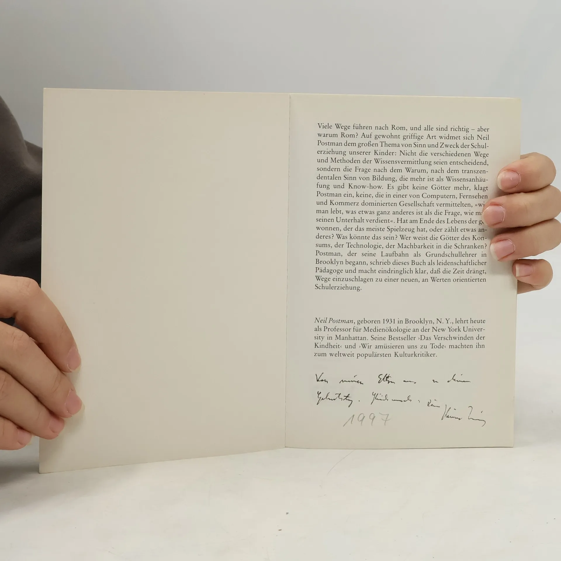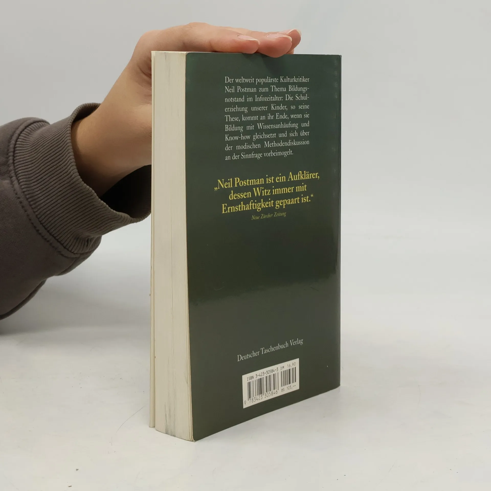 §Es gibt keine Götter mehr, keine, die in einer von Computern, Fernsehen und Kommerz dominierten Gesellschaft vermittelten, "wie man lebt". Griffig, populär und polemisch klagt Neil Postman eine Neubesinnung in der Pädagogik ein: "Ich schreibe dieses Buch in der Hoffnung, die Definition des "Schulproblems" von den Mitteln weg hin zum Zweck, zum Sinn zu verschieben."§§