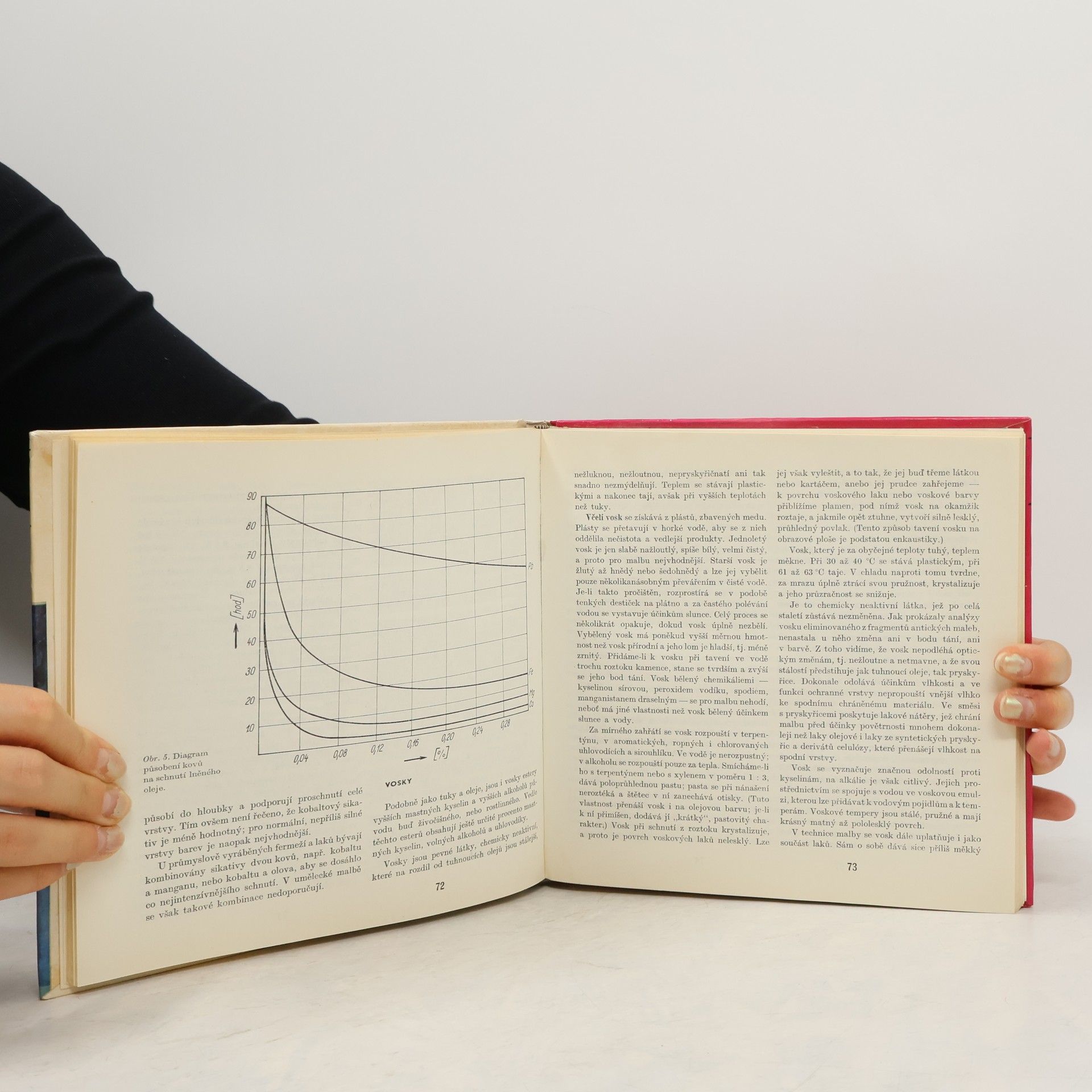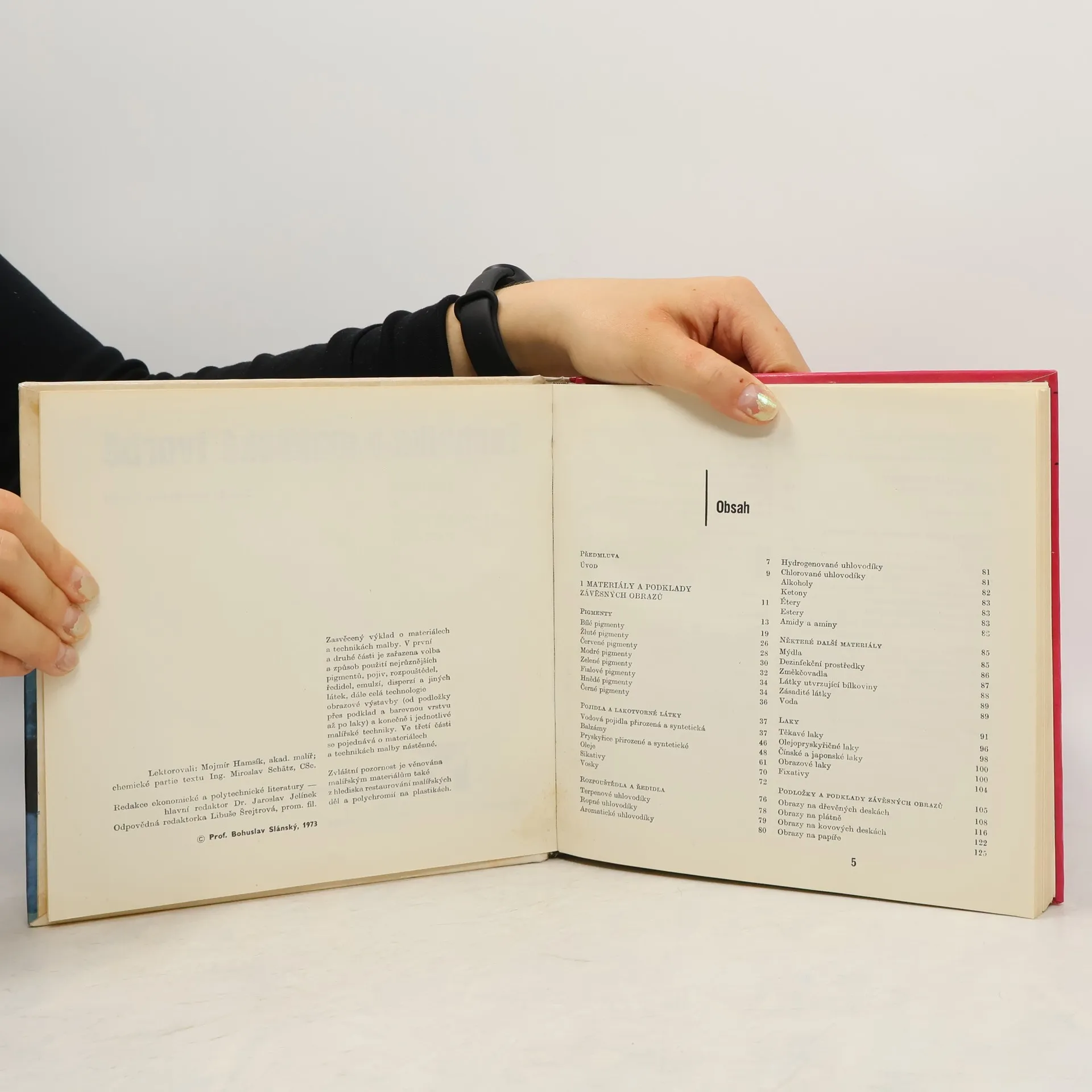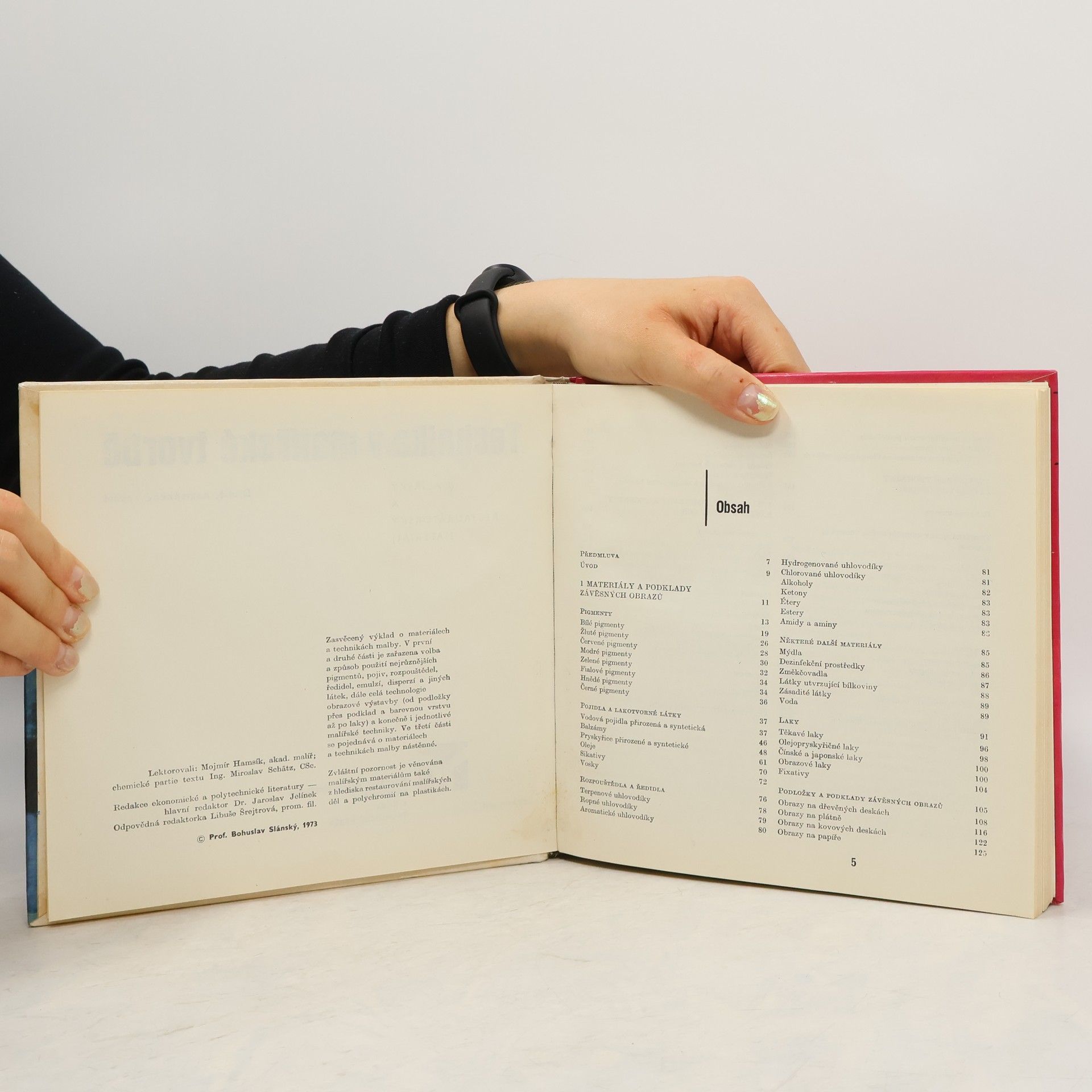 V první části práce vysvětluje restaurátor funkci, druhy a vlastnosti pigmentů, pojidel, rozpouštědel a ředidel, laků, podložek a podkladů pro závěsné obrazy. Druhou část věnuje technice malby těchto obrazů jednoduchýmivodovými barvami, temperou, disperzními a olejovými barvami. V poslední části se zabývá materiály, přípravou podkladu a technickým postupem při vytváření nástěnných maleb.