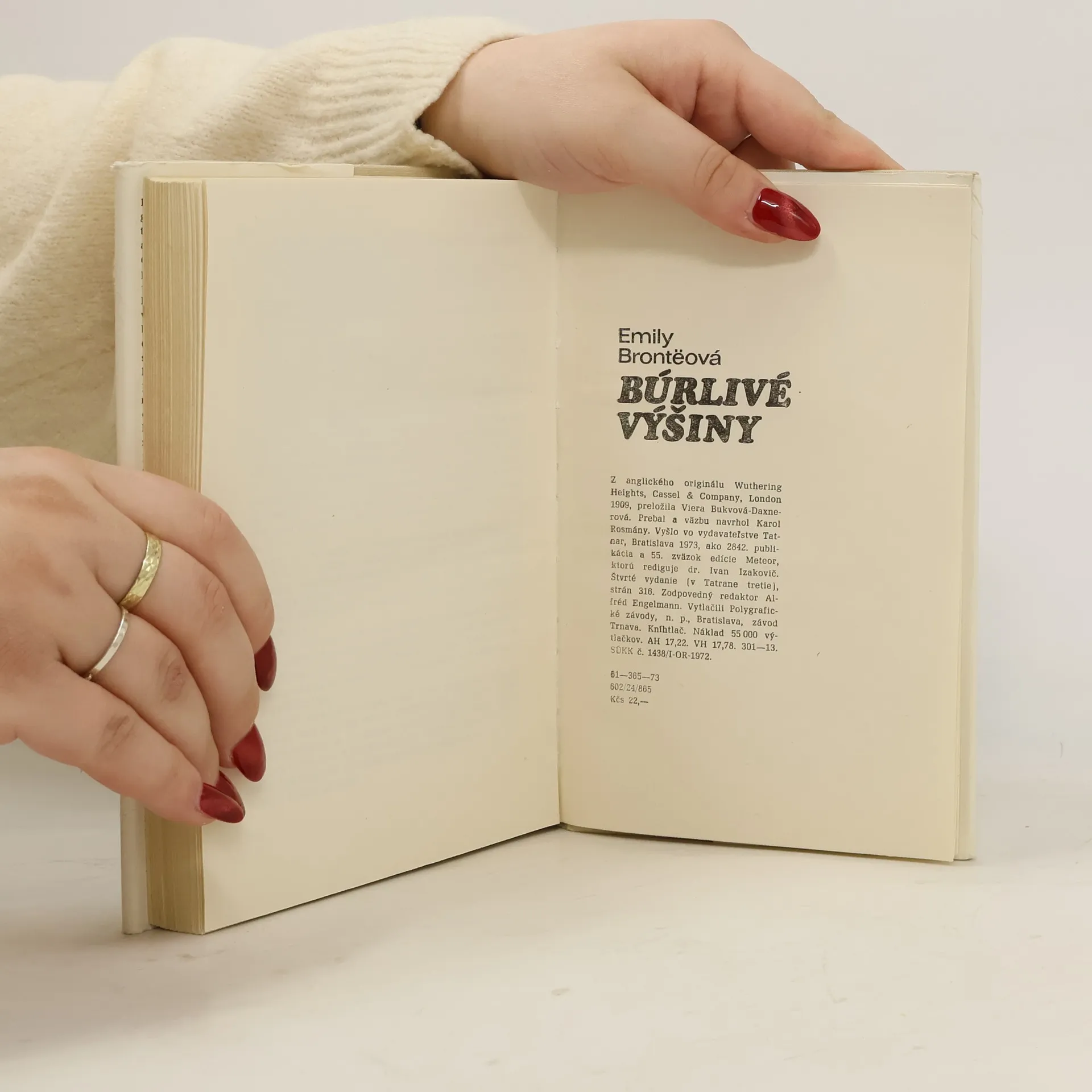 Jediný román významnej anglickej autorky je príbehom o ľudskom ponížení, láske a pomste. Odohráva sa na majetku uprostred bažinatej pustiny západného Yorkshiru. Opustená sirota Heathcliff, ktorej sa statkár ujal, je nenávidený statkárovou ženou a jeho synom, avšak obdivovaný a nakoniec milovaný jeho dcérou. Keď sa po statkárovej smrti ujme hospodárstva syn, donúti sestru, aby sa vydala za bohatého suseda. Heathcliff v čase jej svadby zmizne, ale po rokoch sa vráti ako zámožný muž, aby sa pomstil. 4. slovenské vydanie.
