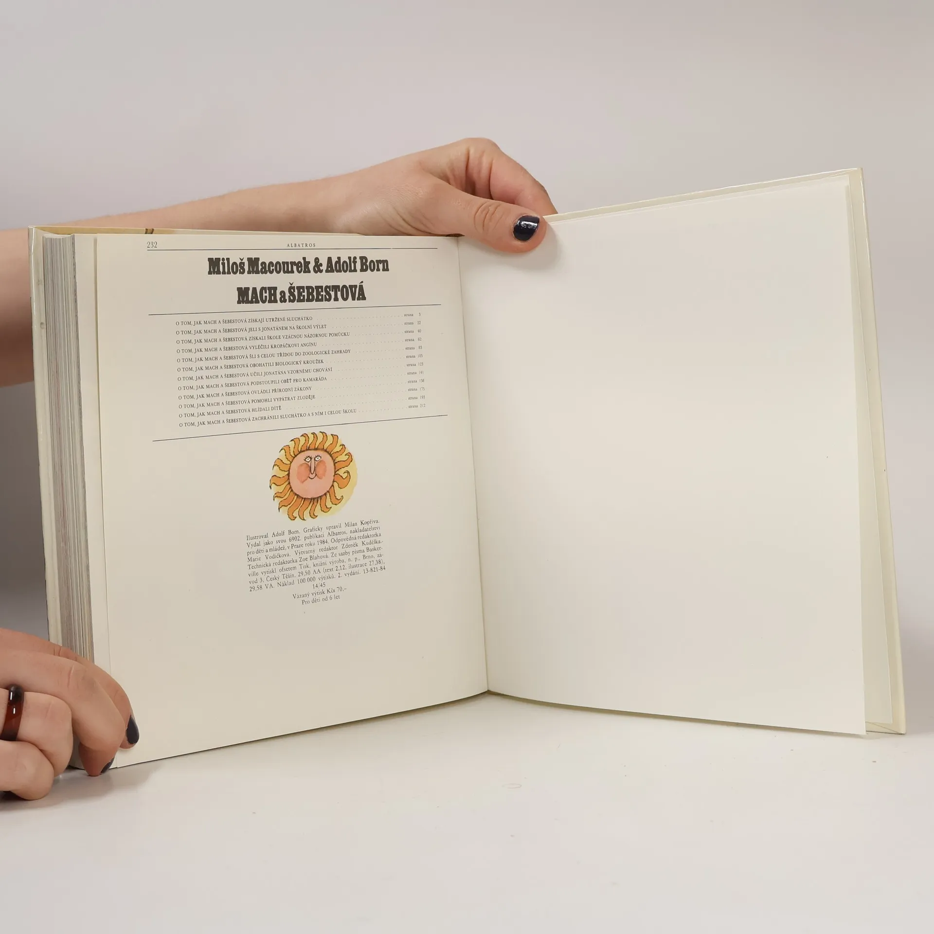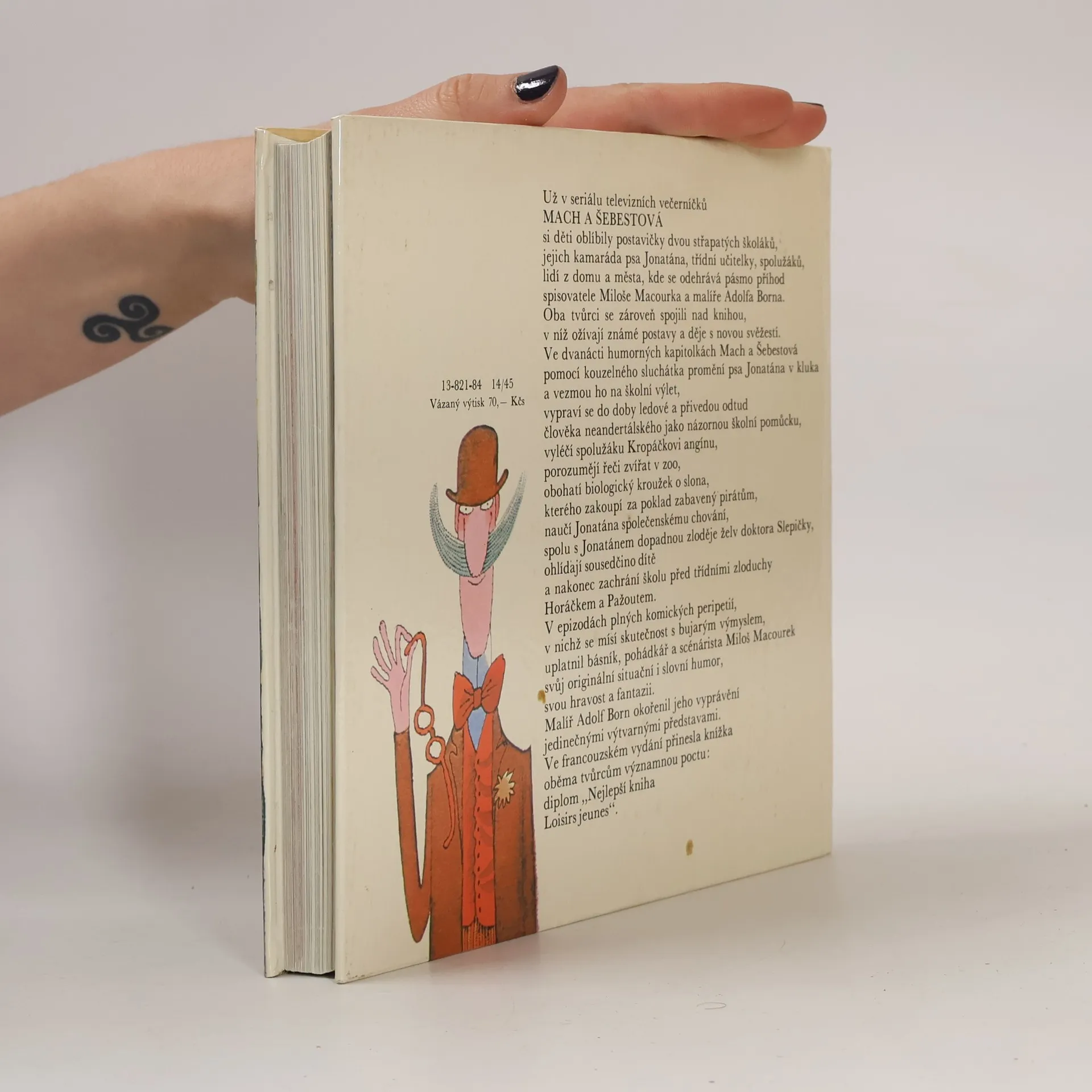 Už v seriálu televizních večerníčků MACH A ŠEBESTOVÁ si děti oblíbily postavičky dvou střapatých školáků, jejich kamaráda psa Jonatána, třídní učitelky, spolužáků, lidí z domu a města, kde se odehrává pásmo příhod spisovatele Miloše Macourka a malíře Adolfa Borna. Oba tvůrcise zároveň spojili nad knihou, v níž ožívají známé postavy a děje s novou svěžestí. Ve dvanácti humorných kapitolkách Mach a Šebestová pomocí kouzelného sluchátka promění psa Jonatána v kluka a vezmou ho na školní výlet, vypraví se do doby ledové a přivedou odtud člověka neandertálského jako názornou školní pomůcku, vyléčí spolužáku Kropáčkovi angínu, porozumějí řeči zvířat v zoo; obohatí biologický kroužek o slona, kterého zakoupí za poklad zabavený pirátům, naučí Jonatána společenskému chování, spolu s Jonatánem dopadnou zloděje želv doktora Slepičky, ohlídají sousedčino dítě a nakonec zachrání školu před třídními zloduchy Horáčkem a Pažoutem. V epizodách plných komických peripetií, v nichž se mísí skutečnost s bujarým výmyslem, uplatnil básník, pohádkář a scénárista Miloš Macourek svůj originální situační i slovní humor, svou hravost a fantazii. Malíř Adolf Born okořenil jeho vyprávění jedinečnými výtvarnými představami. Ve francouzském vydání přinesla knížka oběma tvůrcům významnou poctu : diplom Nejlepší kniha Loisirs jeunes ".