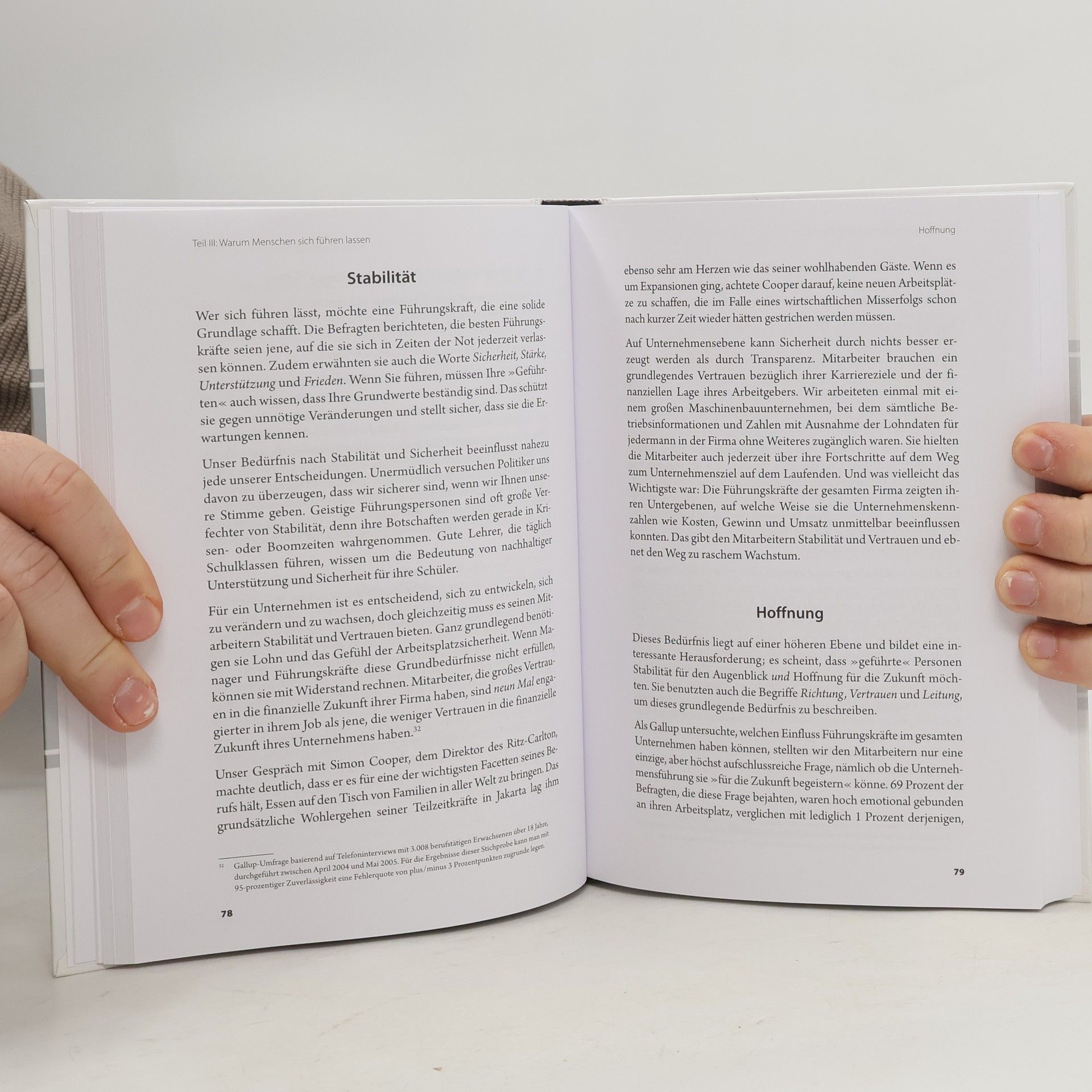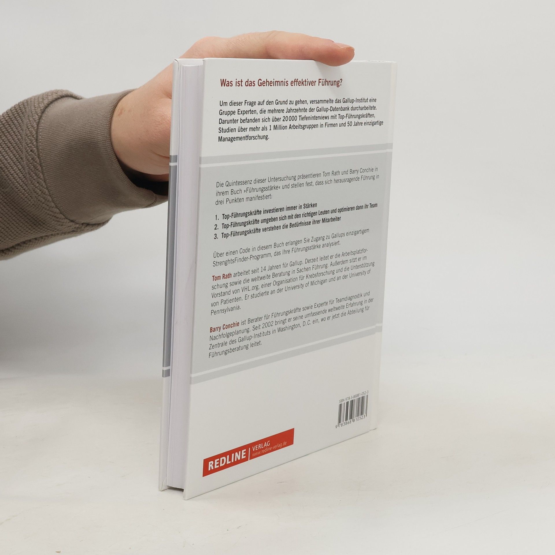 n jahrzehntelanger Forschungsarbeit befragte das renommierte Gallup-Institut weltweit mehr als eine Million Teams, interviewte über 20.000 Top-Führungskräfte und 10.000 Mitarbeiter, um herauszufinden, was überzeugende Führungskräfte ausmacht. Bestsellerautor Tom Rath und Managementberater Barry Coniche analysierten die Studien und leiteten daraus die drei Grundpfeiler effektiver Führung ab: das Bewusstsein der eigenen und der Stärken anderer, die Auswahl der richtigen Mitarbeiter und die Erfüllung der vier wichtigsten Anforderungen, die an die Führungskraft gestellt werden. Das Autorenteam modifiziert den berühmten StrengthsFinder von Gallup auf 34 Situationen im Unternehmensalltag und schafft damit ein Grundlagenwerk für alle, die zur Top-Führungskraft werden wollen.
