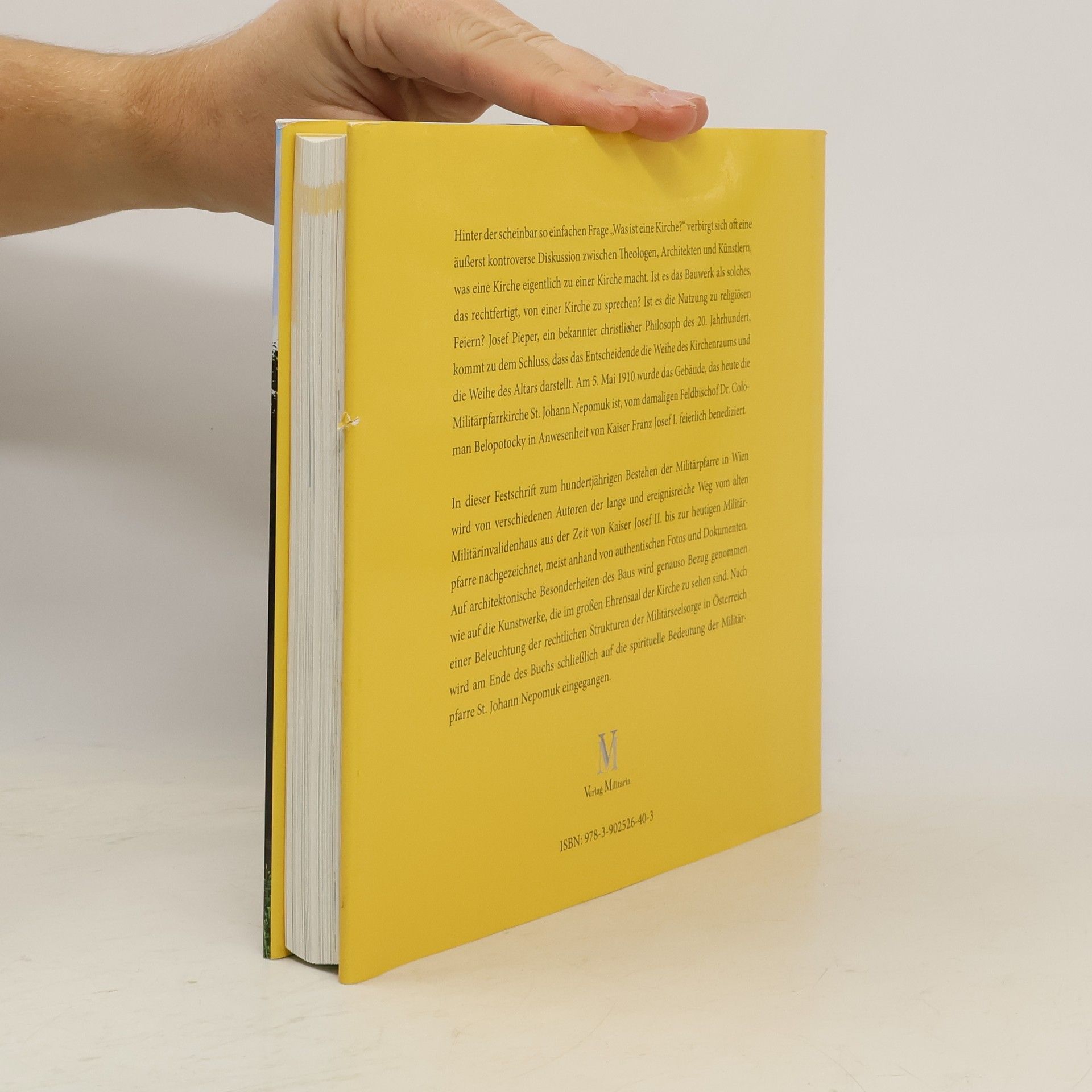 Hinter der scheinbar so einfachen Frage „Was ist eine Kirche?“ verbirgt sich oft eine äußerst kontroverse Diskussion zwischen Theologen, Architekten und Künstlern, was eine Kirche eigentlich zu einer Kirche macht. Ist es das Bauwerk als solches, das rechtfertigt, von einer Kirche zu sprechen? Ist es die Nutzung zu religiösen Feiern? Josef Pieper, ein bekannter christlicher Philosoph des 20. Jahrhundert, kommt zu dem Schluss, dass das Entscheidende die Weihe des Kirchenraums und die Weihe des Altars darstellt. Am 5. Mai 1910 wurde das Gebäude, das heute die Militärpfarrkirche St. Johann Nepomuk ist, vom damaligen Feldbischof Dr. Coloman Belopotocky in Anwesenheit von Kaiser Franz Josef I. feierlich benediziert. In dieser Festschrift zum hundertjährigen Bestehen der Militärpfarre in Wien wird von verschiedenen Autoren der lange und ereignisreiche Weg vom alten Militärinvalidenhaus aus der Zeit von Kaiser Josef II. bis zur heutigen Militärpfarre nachgezeichnet, meist anhand von authentischen Fotos und Dokumenten. Auf architektonische Besonderheiten des Baus wird genauso Bezug genommen wie auf die Kunstwerke, die im großen Ehrensaal der Kirche zu sehen sind. Nach einer Beleuchtung der rechtlichen Strukturen der Militärseelsorge in Österreich wird am Ende des Buchs schließlich auf die spirituelle Bedeutung der Militärpfarre St. Johann Nepomuk eingegangen.