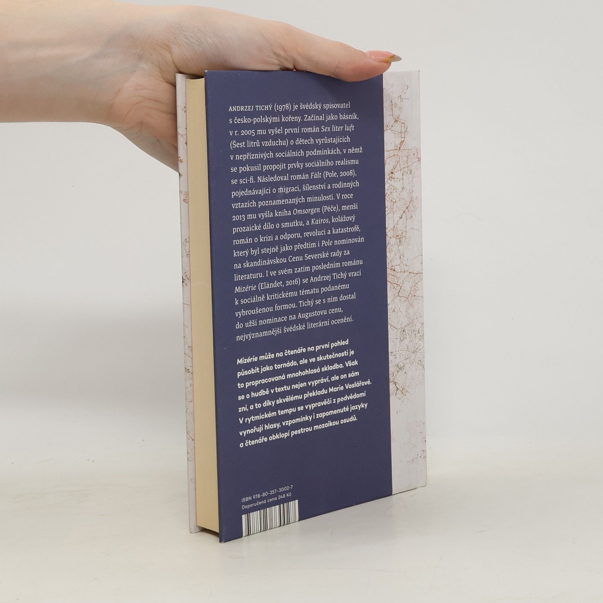 Mizérie se odehrává na předměstí švédského Malmö, kam nechodí nikdo, kdo nemusí. Hlavnímu hrdinovi, mladému cellistovi, se povedlo z tohoto prostředí uniknout, ale možná jen zdánlivě. Náhodné setkání v něm probudí vzpomínky, z podvědomí se vynořují hlasy, zapomenuté jazyky i lidé. Mizérie je román neustálého pohybu, nezadržitelného proudu – rozděluje přítomnost na dvě části, obě současně nemožné, a zároveň nevyhnutelné. Andrzej Tichý píše nemilosrdně a skvěle o bídě a násilí, závislosti i sounáležitosti. Za román získal Andrzej Tichý užší nominaci na nejvýznamnější švédské ocenění, Augustovu cenu.