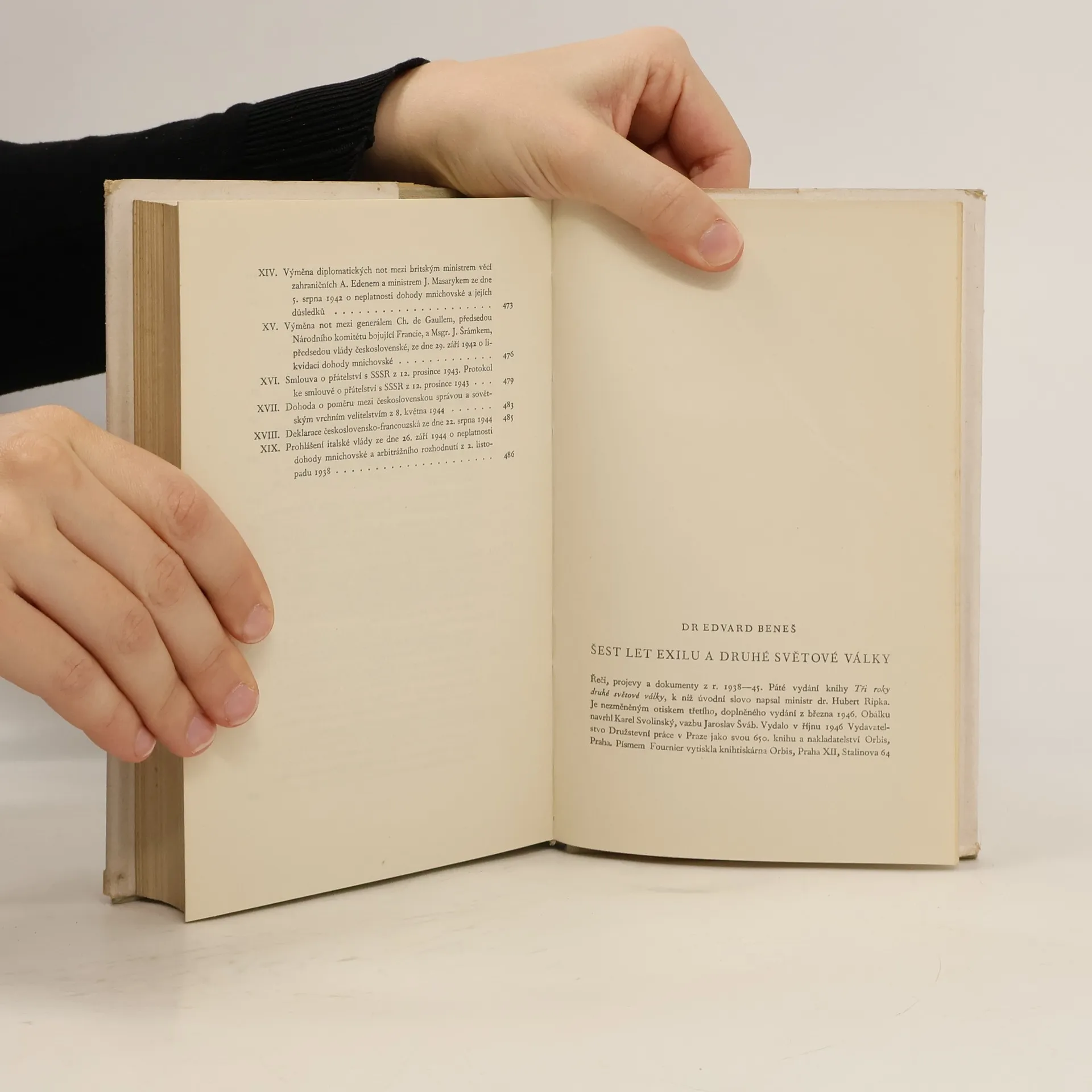 Řeči, projevy a dokumenty z let 1938 - 45. Čtvrté vydání knihy „Tři roky druhé světové války“, k níž úvodní slovo napsal ministr dr. Hubert Ripka. Je nezměněným otiskem třetího, doplněného vydání z března 1946. Obálku navrhl Karel Svolinský, vazbu Jaroslav Šváb. Vydalo v červnu 1946 Vydavatelstvo Družstevní práce v Praze a nakladatelství Orbis, Praha.