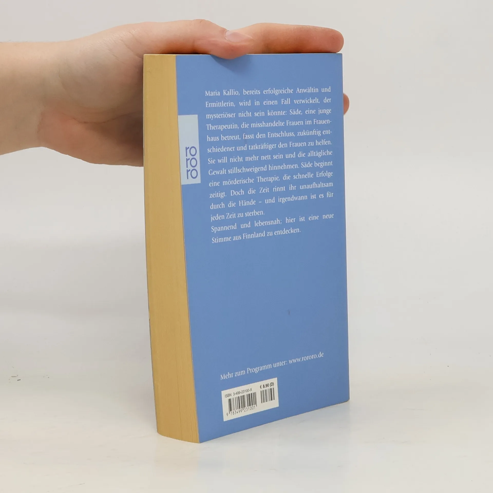 Maria Kallio, bereits erfolgreiche Anwältin und Ermittlerin, wird in einen Fall verwickelt, der mysteriöser nicht sein könnte: Säde, eine junge Therapeutin, die misshandelte Frauen im Frauen haus betreut, fasst den Entschluss, zukünftig entschiedener und tatkräftiger den Frauen zu helfen. Sie will nicht mehr nett sein und die alltägliche Gewalt stillschweigend hinnehmen. Säde beginnt eine mörderische Therapie, die schnelle Erfolge zeitigt. Doch die Zeit rinnt ihr unaufhaltsam durch die Hände – und irgendwann ist es für jeden Zeit zu sterben.Spannend und lebensnah; hier ist eine neue Stimme aus Finnland zu entdecken.