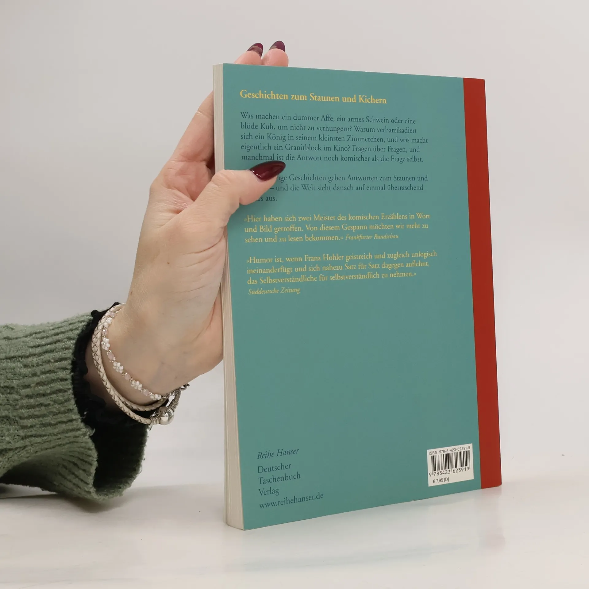 Wenn Franz Hohler erzählt und Nikolaus Heidelbach illustriert, sieht die Welt auf einmal überraschend anders aus. Was machen ein dummer Affe, ein armes Schwein oder eine blöde Kuh, um nicht zu verhungern? Warum verbarrikadiert sich ein König in seinem kleinsten Zimmerchen, und was macht eigentlich ein Granitblock im Kino? Fragen über Fragen, die nach Antworten drängen. Und manchmal ist die Antwort noch überraschender als die Frage – 30 Hohler-Geschichten zum Staunen und Kichern.