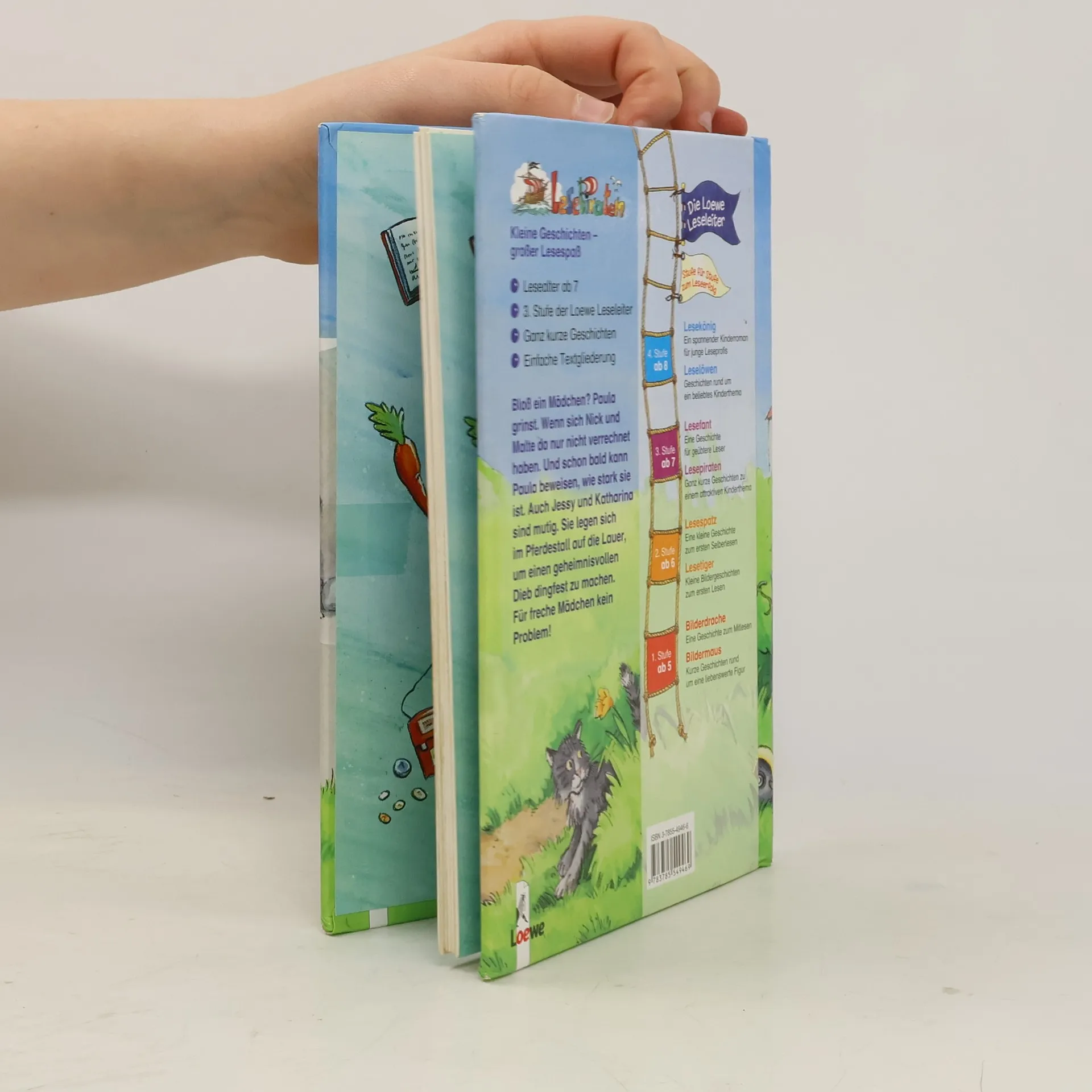 Lesealter ab 7 3. Stufe der Loewe-Leseleiter Ganz kurze Geschichten Einfache Textgliederung Bloß ein Mädchen? Paula grinst. Wenn sich Nick und Malte da nur nicht verrechnet haben. Und schon bald kann Paula beweisen, wie stark sie ist. Auch Jessy und Katharina sind mutig. Sie legen sich im Pferdestall auf die Lauer, um einen geheimnisvollen Dieb dingfest zu machen. Für freche Mädchen kein Problem!