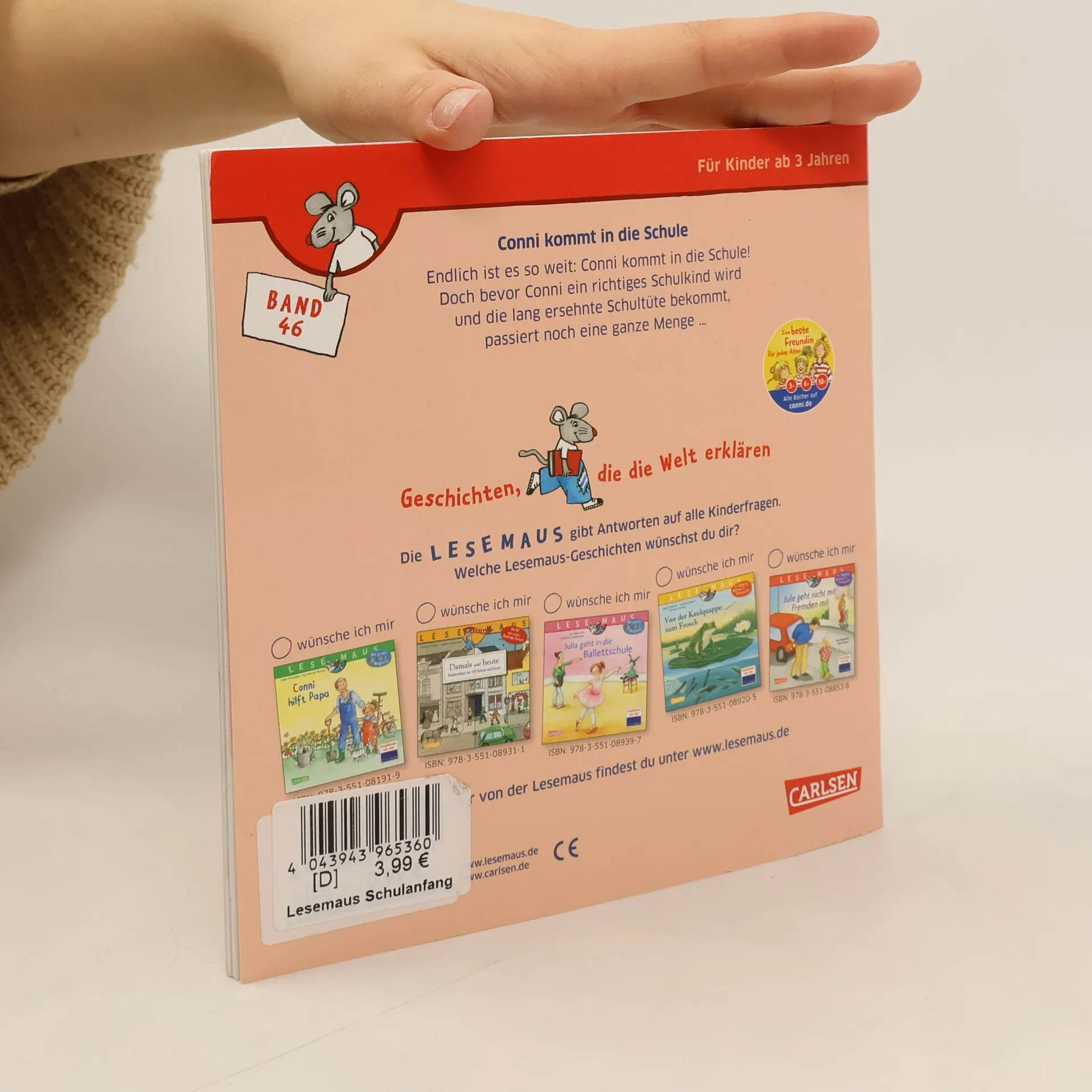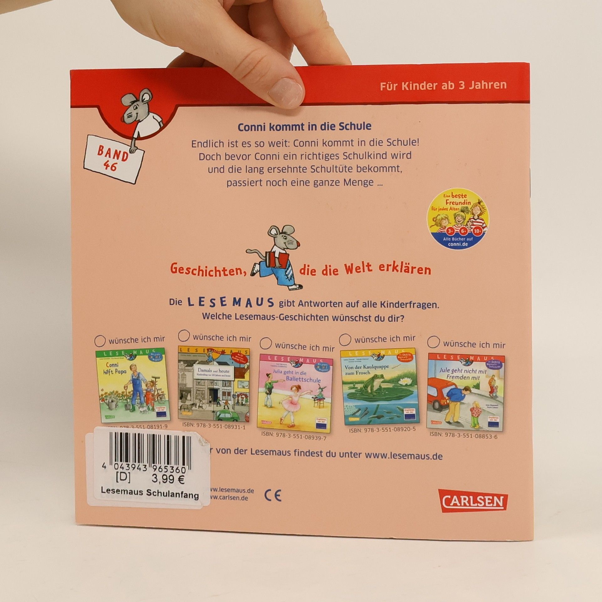 Endlich ist es so weit: Conni kommt in die Schule! Doch bevor Conni ein richtiges Schulkind wird und die lang ersehnte Schultüte bekommt, muss noch eine ganze Menge passieren ... *** LESEMAUS – Geschichten, die die Welt erklären! *** Die Bilderbücher für Kinder ab 3 Jahren sind ideal zum gemeinsamen Anschauen und Vorlesen. Verständliche Texte und hochwertige Illustrationen vermitteln erstes Sachwissen zu wichtigen Themen aus dem Kinderalltag. Empfohlen von der Stiftung Lesen.