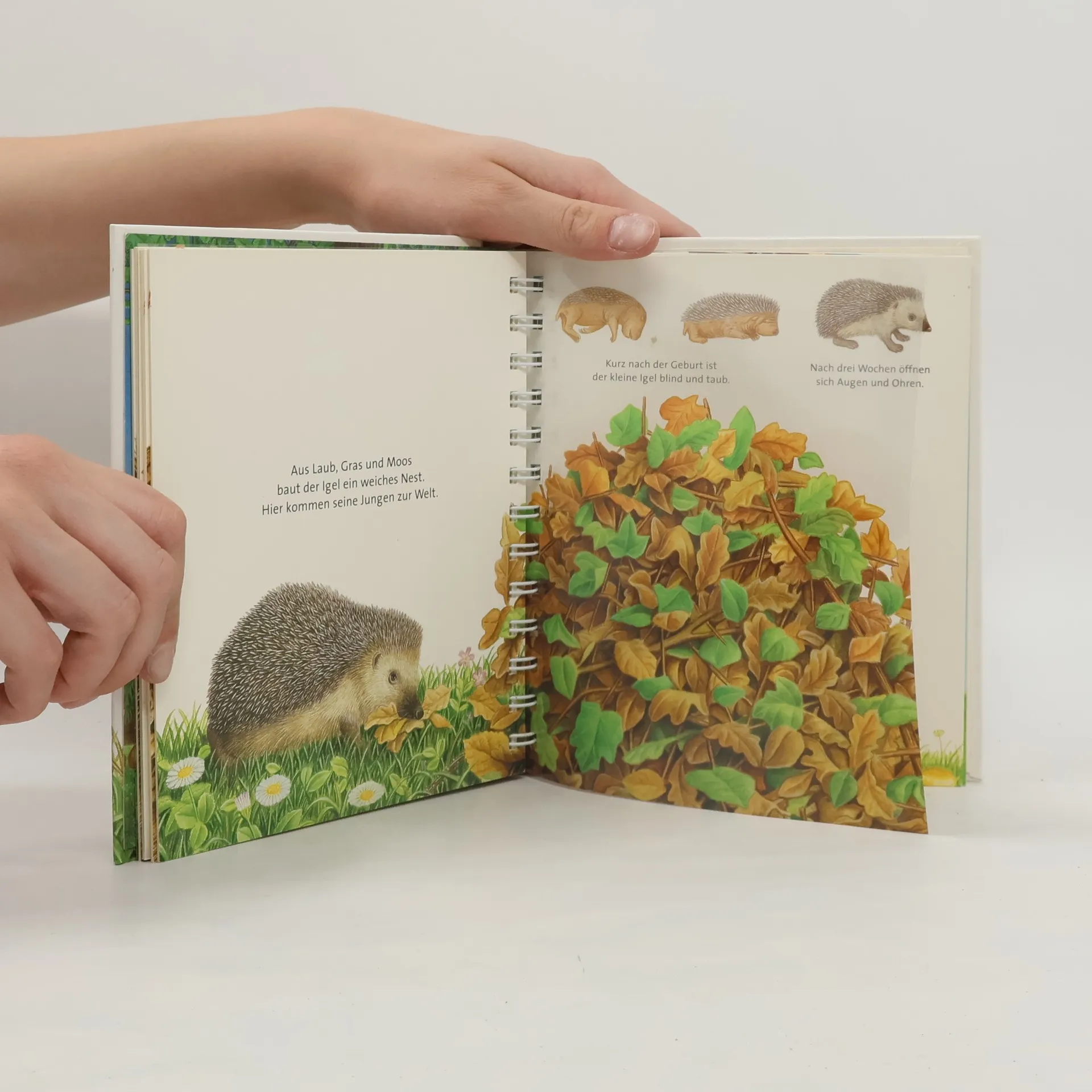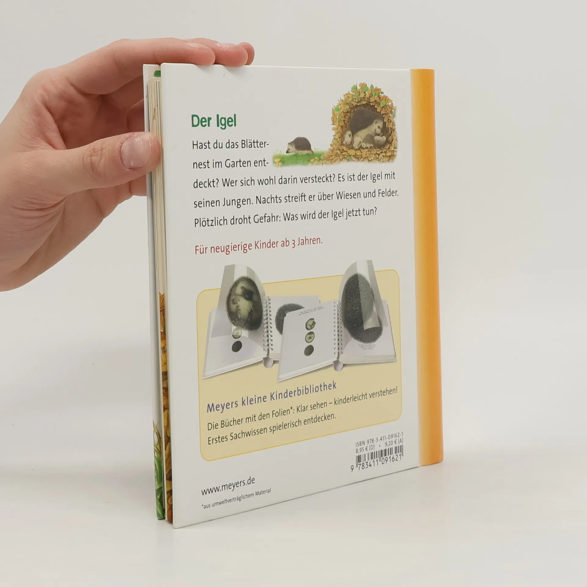 Durch spannende Effekte vermittelt die Bilderbuchreihe „Meyers kleine Kinderbibliothek“ erstes Sachwissen für Kinder ab 3 Jahren. Transparente Folien zeigen beim Umblättern das Innenleben von Dingen, machen Verdecktes sichtbar oder veranschaulichen Veränderungen. Hier erfahren die jungen Leser, wie der Igel nach seinem Winterschlaf in der Nacht hungrig über Wiesen und Felder streift, um Nahrung zu suchen. Außerdem können sie beobachten, wie er sich zu einer Stachelkugel zusammenrollt, sobald Gefahr droht.
