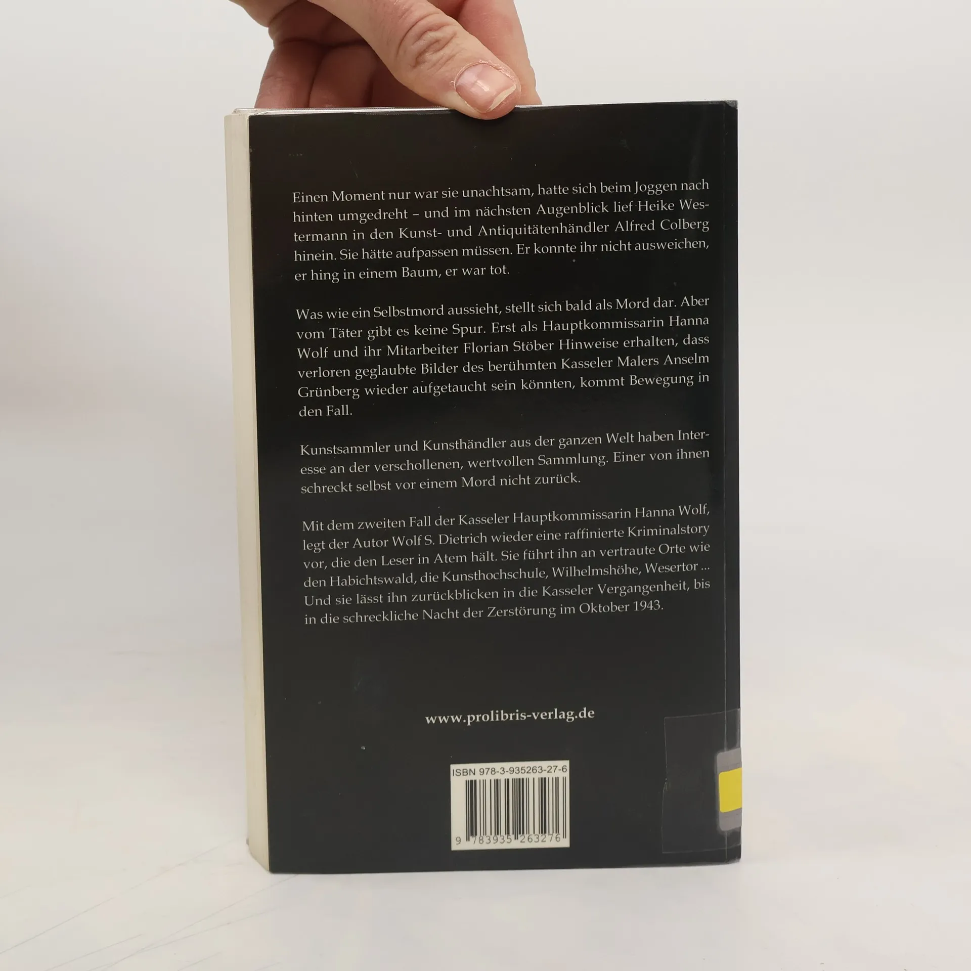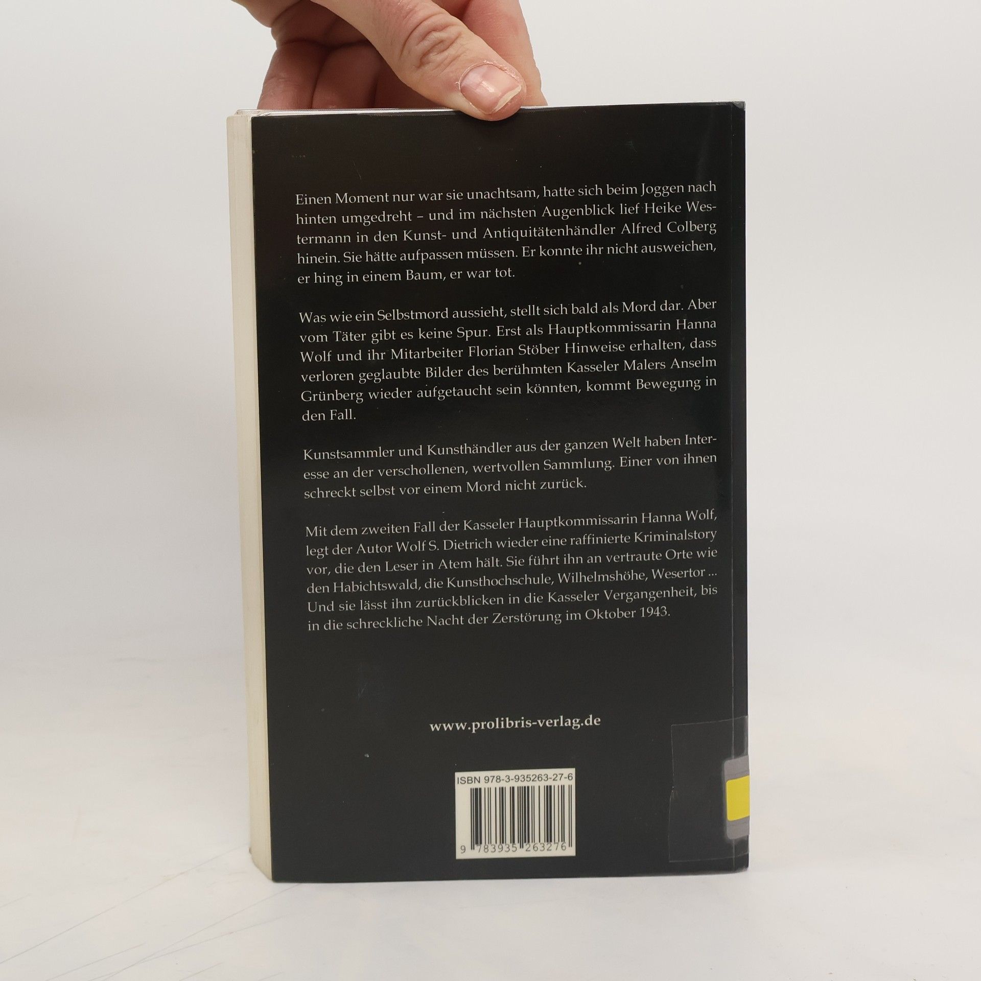 Einen Moment nur war sie unachtsam, hatte sich beim Joggen nach hinten umgedreht – und im nächsten Augenblick lief Heike Westermann in den Kunst- und Antiquitätenhändler Alfred Colberg hinein. Sie hätte aufpassen müssen. Er konnte ihr nicht ausweichen, er hing in einem Baum, er war tot. Was wie ein Selbstmord aussieht, wird von der Kasseler Kripo bald als Mord entlarvt. Aber Täter und Motiv bleiben im Dunkeln. Erst als Hauptkommissarin Hanna Wolf und ihr Mitarbeiter Florian Stöber auf Hinweise stoßen, dass verloren geglaubte Bilder des Kasseler Malers Anselm Grünberg wieder aufgetaucht sein könnten, kommt Bewegung in den Fall. Kunstsammler- und Kunsthändler aus der ganzen Welt haben Interesse an der verschollenen Sammlung, leidenschaftliches Interesse, das auch durch die Aussicht auf einen Millionengewinn genährt wird. Einer von ihnen schreckt auch vor einem Mord nicht zurück. Mit dem zweiten Fall der Kasseler Hauptkommissarin Hanna Wolf und seinem vierten Kriminalroman im Prolibris Verlag hat der Autor Wolf S. Dietrich eine raffinierte Kriminalstory geschrieben, die den Leser in Atem hält. Sie führt ihn an vertraute Orte und Institutionen wie den Habichtswald, die Kunsthochschule, Wilhelmshöhe, Wesertor. Und sie lässt ihn zurückblicken in die Kasseler Vergangenheit, bis in die schreckliche Nacht der Zerstörung im Oktober 1943.