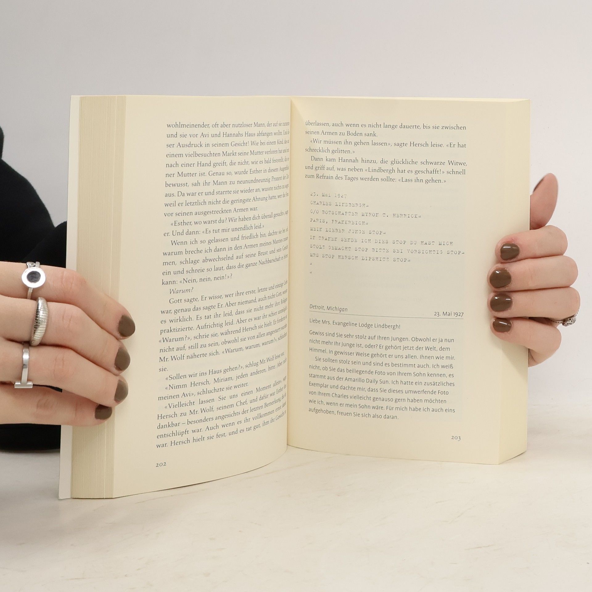 1907: Als in Russland Pogrome ausbrechen, wandert Familie Lipshitz mit ihren Kindern nach Amerika aus. Doch als sie Ellis Island erreichen, ist Ruben, der Jüngste, verschwunden. Zwanzig Jahre später sieht Mutter Esther ein Bild von Charles Lindbergh in der Zeitung. Für sie ist jeder Zweifel ausgeschlossen: Lindbergh ist ihr verlorener Sohn. 2002: T Cooper, letzter Spross der Lipshitz, kauft sich einen Modellbausatz von Lindberghs Flugzeug und baut ihn zusammen - fest entschlossen, für die Fragezeichen in der Familienchronik endlich eine Antwort zu finden. Spiegel-Bestseller