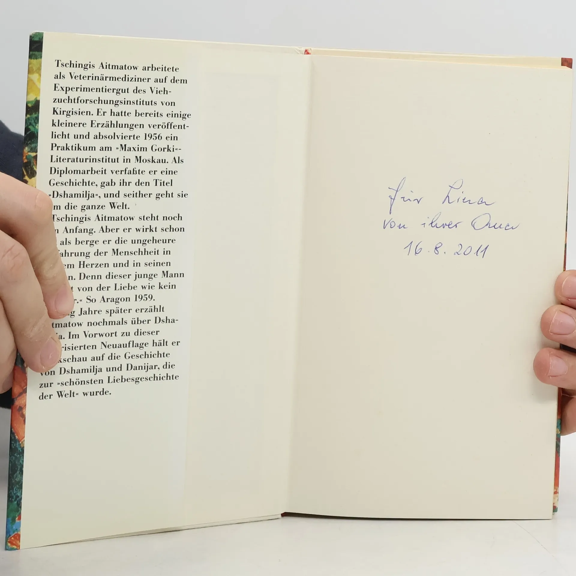 Tschingis Aitmatow arbeitete als Veterinärmediziner auf dem Experimentiergut des Viehzuchtforschungsinstituts von Kirgisien. Er hatte bereits einige kleinere Erzählungen veröffentlicht und absolvierte 1956 ein Praktikum am Maxim Gorki-Literaturinstitut in Moskau. Als Diplomarbeit verfasste er eine Geschichte, gab ihr den Titel "Dshamilja", und seither geht sie um die ganze Welt.