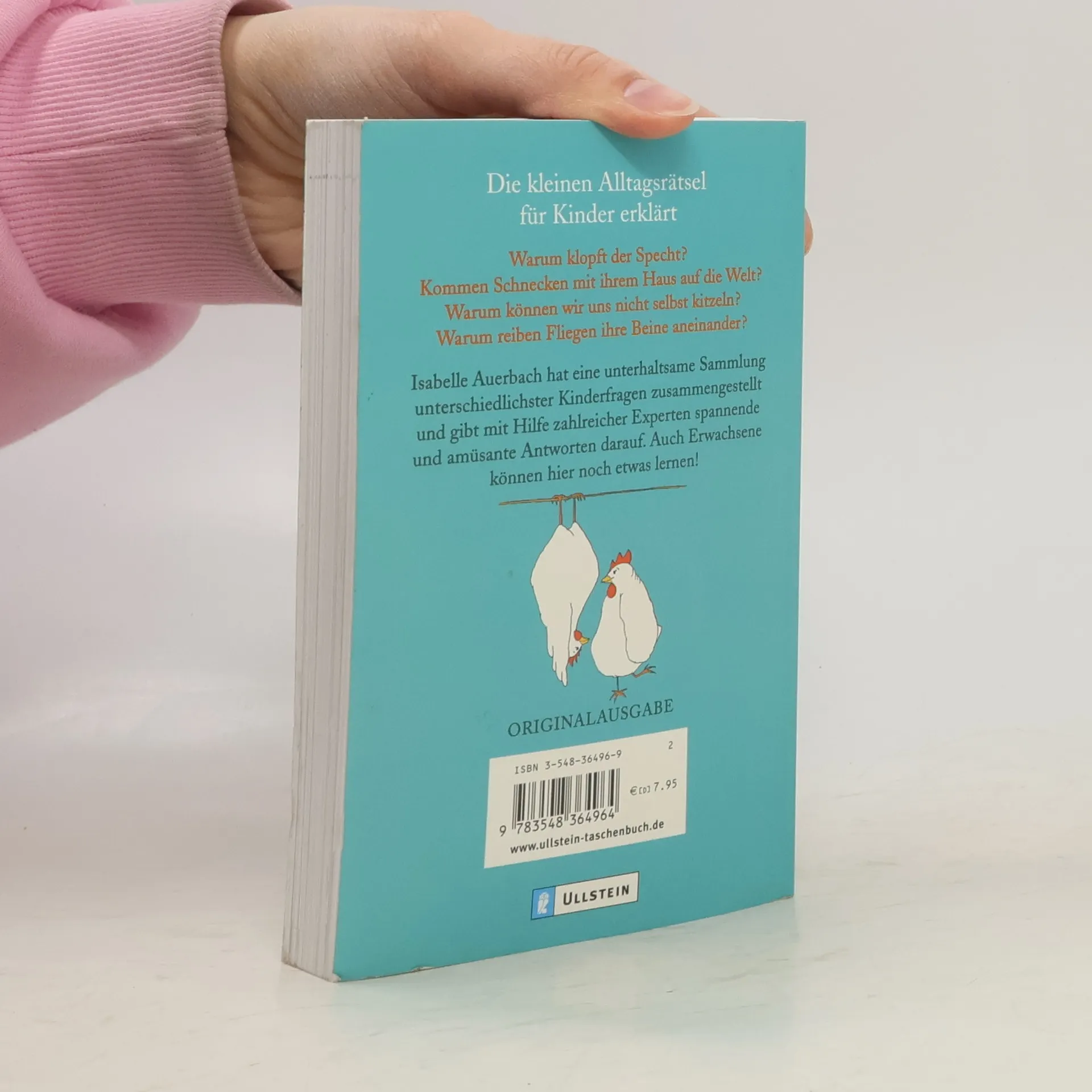 Kinder können einem Löcher in den Bauch fragen: Warum klopft der Specht? Kommen Schnecken mit ihrem Haus auf die Welt? Warum können wir uns nicht selbst kitzeln? Warum reiben Fliegen ständig ihre Beine aneinander? Isabelle Auerbach hat eine unterhaltsame Sammlung unterschiedlichster Kinderfragen zusammengestellt und gibt mit Hilfe zahlreicher Experten spannende und amüsante Antworten darauf. Auch Erwachsene können hier noch etwas lernen!