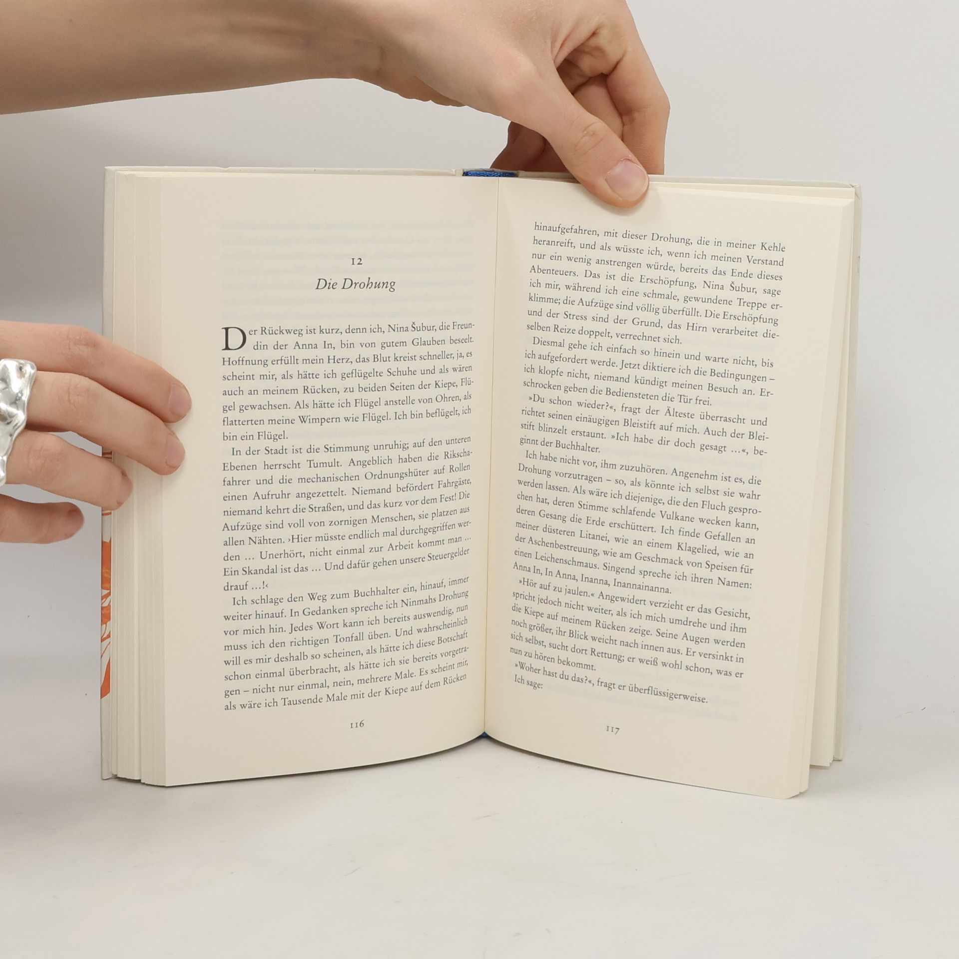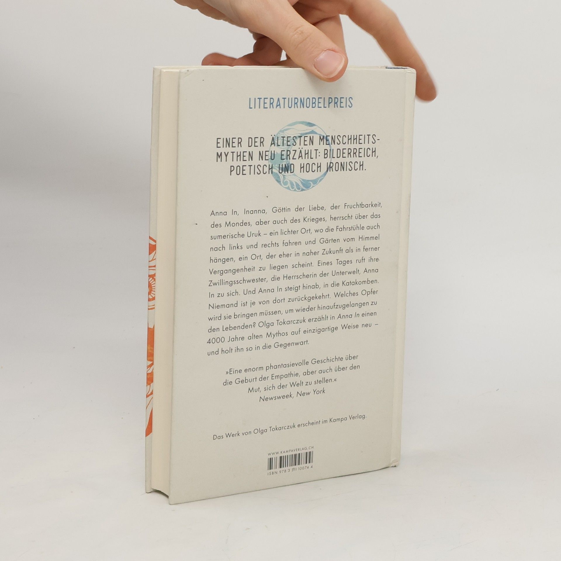„Keine Definition von Mythos, die ich kenne, ist so ungewöhnlich, paradox und witzig wie die von Karl Kerényi geprägte: Mythos ist die Epiphanie des Göttlichen im Sprachzentrum des menschlichen Hirns. Man könnte es auch so ausdrücken: ein Mythos ist in dem Maße wirklich, in dem alles, was wahrgenommen wird, auch wirklich ist. Solange wir die Götter auf ihren Reisen, Abenteuern, in ihren Metamorphosen, ihren Schöpfungen und Apokalypsen begleiten, existieren sie auch. Und so existiert auch Inanna. Mit dieser Geschichte habe ich auf einen der ältesten Mythen der Menschheit zurückgegriffen. Die Heldin ist die sumerische Göttin Inanna, Tochter des Mondgottes und der Mondgöttin, Herrscherin über die Stadt Uruk, die Göttin von Liebe und Krieg. Sie wird mit dem Planeten Venus assoziiert und in Gestalt des Abend- und Morgen-sterns verehrt. Einerseits gilt sie als Schutzpatronin der körperlichen Liebe, andererseits steht sie als die ungestüme und unstete Kriegsgöttin für das Streben ihres Volkes nach größerer Macht.“ Olga Tokarczuk