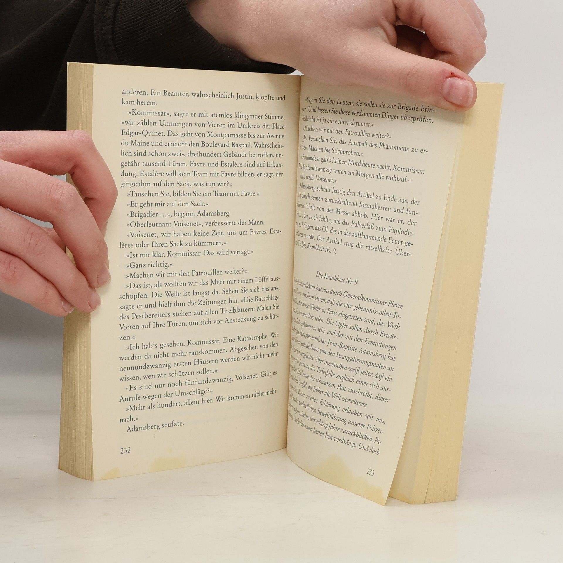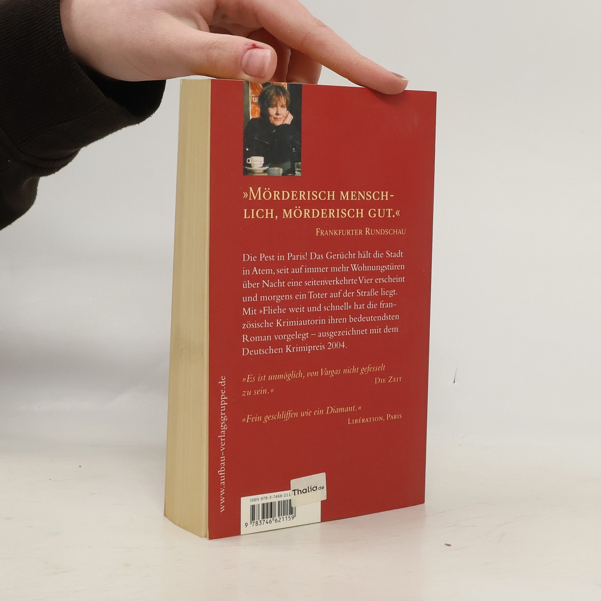 Fliehe weit und schnell Die Pest in Paris! Das Gerücht hält die Stadt in Atem, seit auf immer mehr Wohnungstüren über Nacht eine seitenverkehrte 4 erscheint und morgens ein Toter auf der Straße liegt - schwarz. Kommissar Adamsberg sitzt in einer kleinen Brasserie in Montparnasse. Im Kopf hat er eine rätselhafte lateinische Formel, die auf jenen Türen stand - und vor sich, am Metroausgang, einen bretonischen Seemann, der anonyme Annoncen verliest. Auch lateinische darunter. Aber wo ist der Zusammenhang zwischen den immer zahlreicheren Toten in der Stadt und den sympathischen kleinen Leuten, die dem Bretonen so gebannt zuhören? Plötzlich hat Adamsberg, der Mann mit der unkontrollierten Phantasie, eine Vision. Ein meisterhafter Roman voll düsterer Spannung, leiser Poesie und Vargas' unnachahmlich schrägen Dialogen. Ausgezeichnet mit dem Deutschen Krimipreis 2004, dem Preis der französischen Buchhändler und dem der Leserinnen von „Elle“. „Mörderisch menschlich, mörderisch gut.“ Frankfurter Rundschau