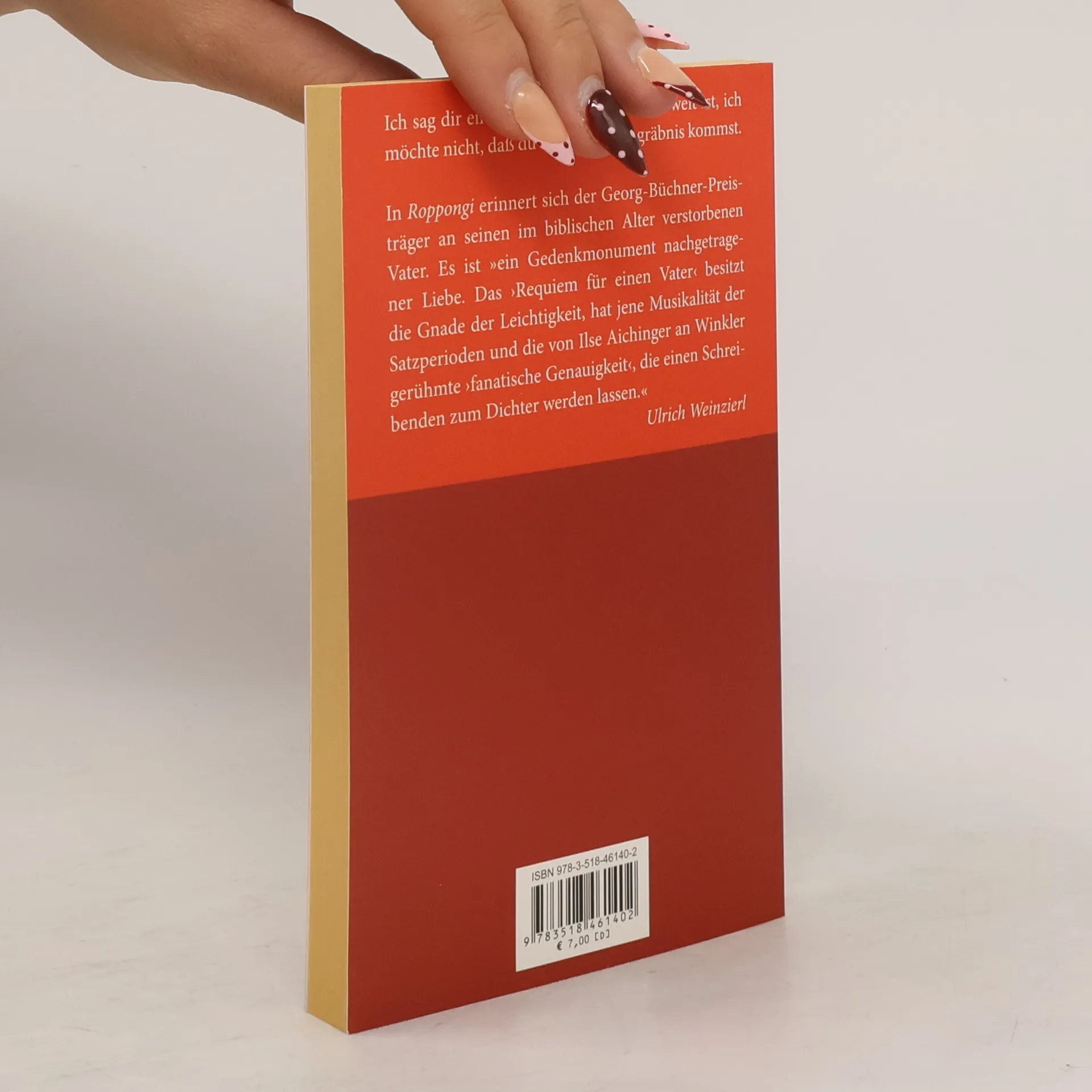 „Als ich mich vor drei Jahren mit meiner Familie in Tokio aufhielt, wo wir im Stadtteil Roppongi wohnten, starb im Alter von 99 Jahren mein Vater, der mir ein Jahr vor seinem Tod in einem kurzen, aber dramatischen Telefonmonolog mitteilte, daß, wenn es soweit sei, ich nicht zu seinem Begräbnis kommen solle.“ »In Roppongi erinnert sich der Georg-Büchner-Preisträger 2008 an seinen im biblischen Alter verstorbenen Vater. Es ist ein „Gedenkmonument nachgetragener Liebe. Das ‚Requiem für einen Vater’ besitzt die Gnade der Leichtigkeit, hat jene Musikalität der Satzperioden und die von Ilse Aichinger an Winkler gerühmte ‚fanatische Genauigkeit’, die einen Schreibenden zum Dichter werden lassen. ‚Ja, Vater, mach’s gut’, vernehmen wir da als Nachruf, ‚ich wünsche dir eine gute Reise’.« Ulrich Weinzierl in seiner Laudatio auf den Georg-Büchner-Preisträger