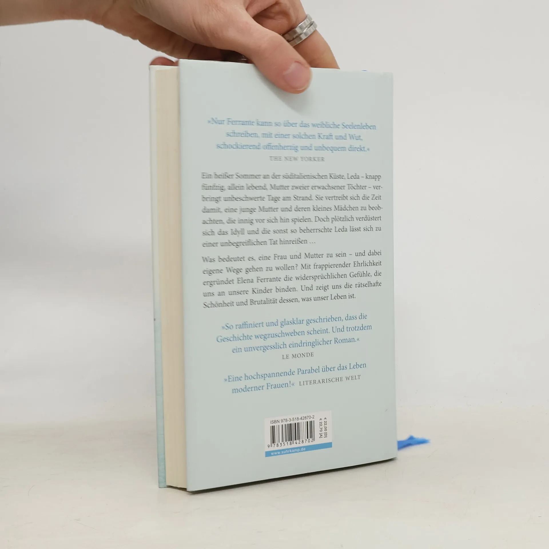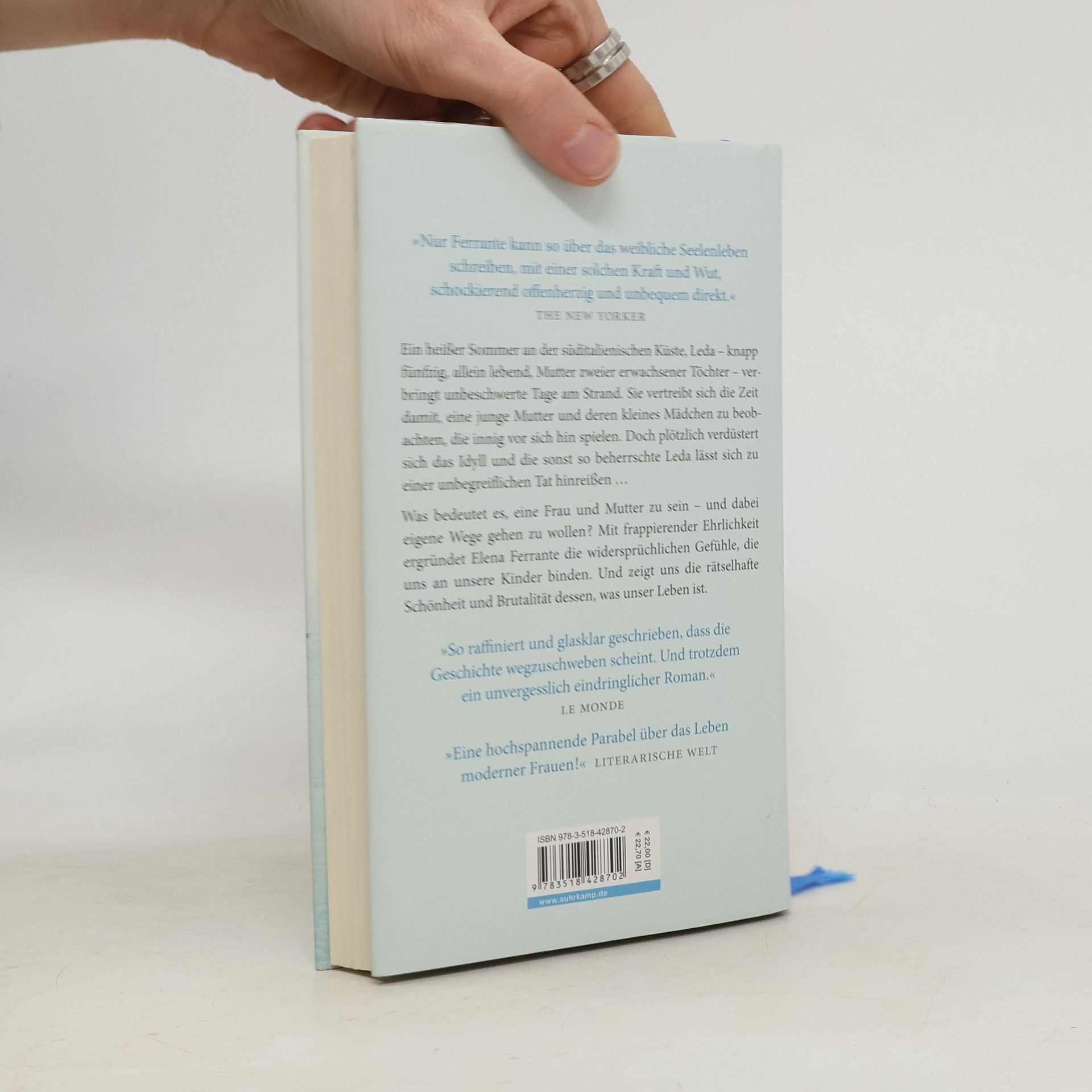 Leda ist fast fünfzig, geschieden, sie unterrichtet Englisch an der Universität in Florenz. Die erwachsenen Töchter sind jetzt beim Vater in Kanada, und Leda muss sich eingestehen, dass sie statt der erwarteten Sehnsucht vor allem Erleichterung empfindet. Den heißen Sommer verbringt sie in einem süditalienischen Küstenort: Bücher, Sonne, das Meer, was könnte friedlicher sein? Am Strand macht sich neben ihr allerdings eine übermütig lärmende neapolitanische Großfamilie breit, darunter eine noch junge Mutter und deren kleine Tochter. Leda beobachtet die beiden über Tage, zunächst fasziniert, wohlwollend. Allmählich aber schlägt ihre Stimmung um, irgendwann folgt sie einem Impuls und tut dem kleinen Mädchen und der Familie etwas Unbegreifliches an. Und wird selber heimgesucht, von lange verdrängten Erinnerungen – an gravierende Entscheidungen, die sie zu treffen hatte, ganz zum Leidwesen ihrer eigenen Töchter ... Was bedeutet es, eine Frau und Mutter zu sein? Mit frappierender Ehrlichkeit ergründet Elena Ferrante die widersprüchlichen Gefühle, die uns an unsere Kinder binden.