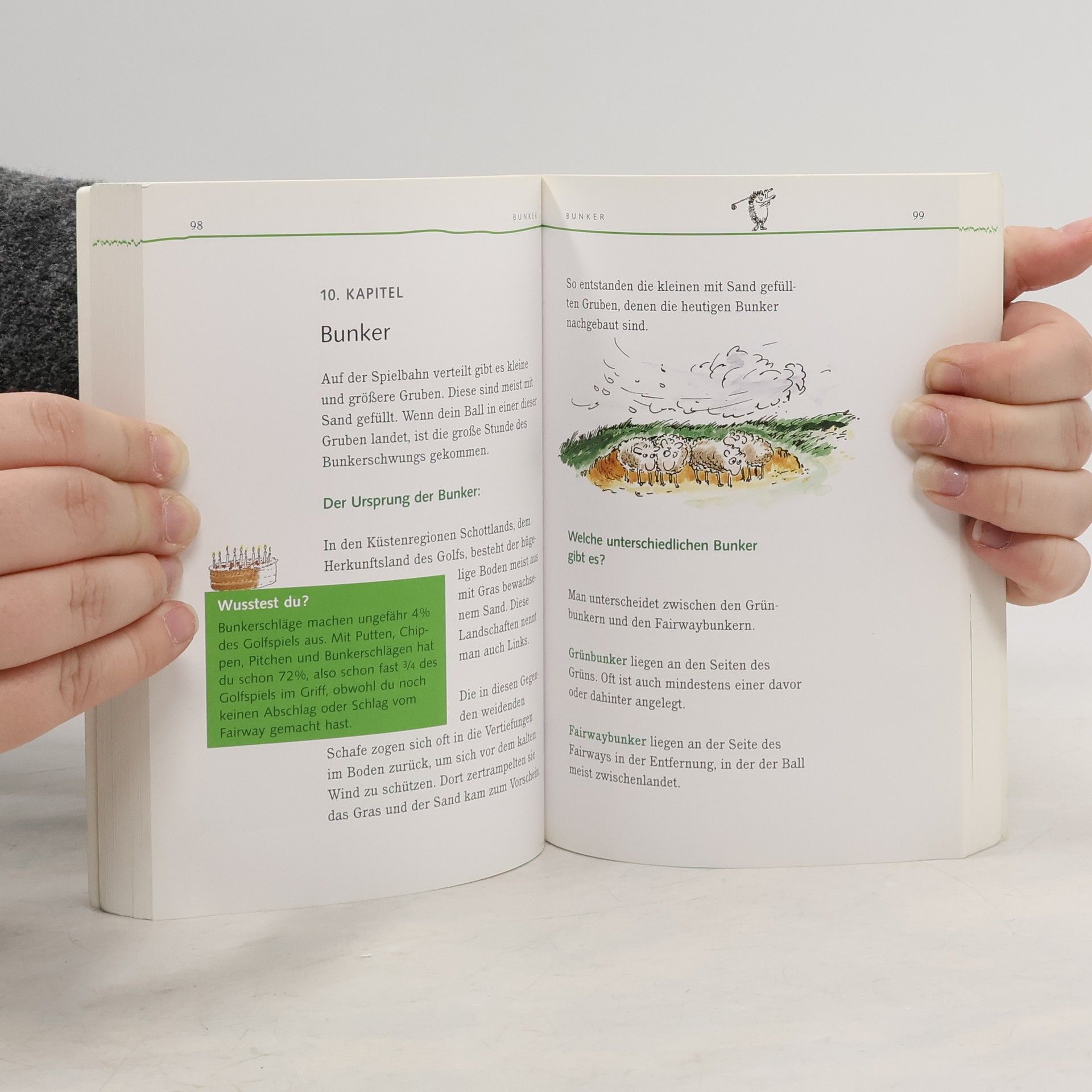 Überarbeitete Neuauflage, mit neuen Golfregeln ab 2008! Lust auf Golf? Technik-Regeln und Etikette - perfekt für die Vorbereitung auf die Platzreifeprüfung! Empfohlen von Verbänden, Profigolfer Alex Cejka, zahlreichen Pressestimmen und vielen Trainern und begeisterten Fans. Golfen ganz einfach, sprich „kinderleicht“, der Titel ist Programm bei diesem außergewöhnlichen Buch für Kids und Einsteiger jeden Alters. Damit Golfen nicht nur auf dem Platz Spaß macht, sondern die sonst oft sehr trockene und abstrakte Regellektüre nicht mehr nur Pflichtprogramm ist, wurde dieses Buch gemacht. Gut strukturierter, leicht leserlicher, amüsanter Text und 288 erklärende witzige Illustrationen machen dieses Buch einzigartig. In 15 Kapiteln wird auf 224 Seiten von der Geschichte über die Schwungtechnik und die Besonderheiten bei Putten, Chippen, Pitchen, Bunker und Abschlag alles über Golf bildhaft erklärt. Viele überraschende „Wusstest Du?“ sorgen für eindruckschindendes Fachwissen und ganz nebenbei wird man durch den ausführlichen Regel- und Etiketteteil (Golfregeln gültig ab 2008) mit vielen Beispielen auch noch regelfest und ein Meister der „Golfsprache“.