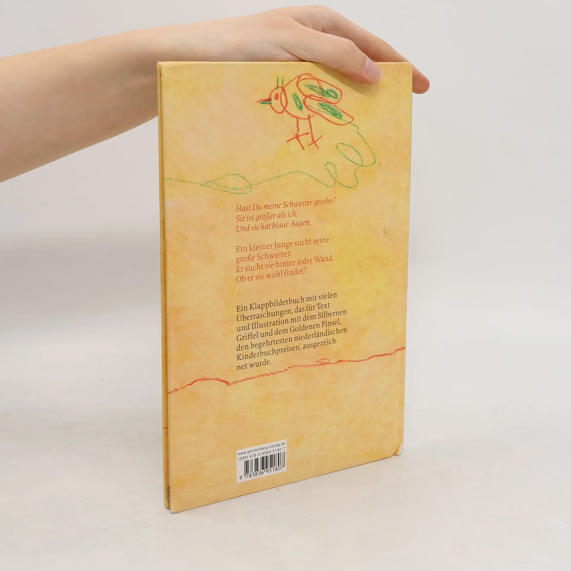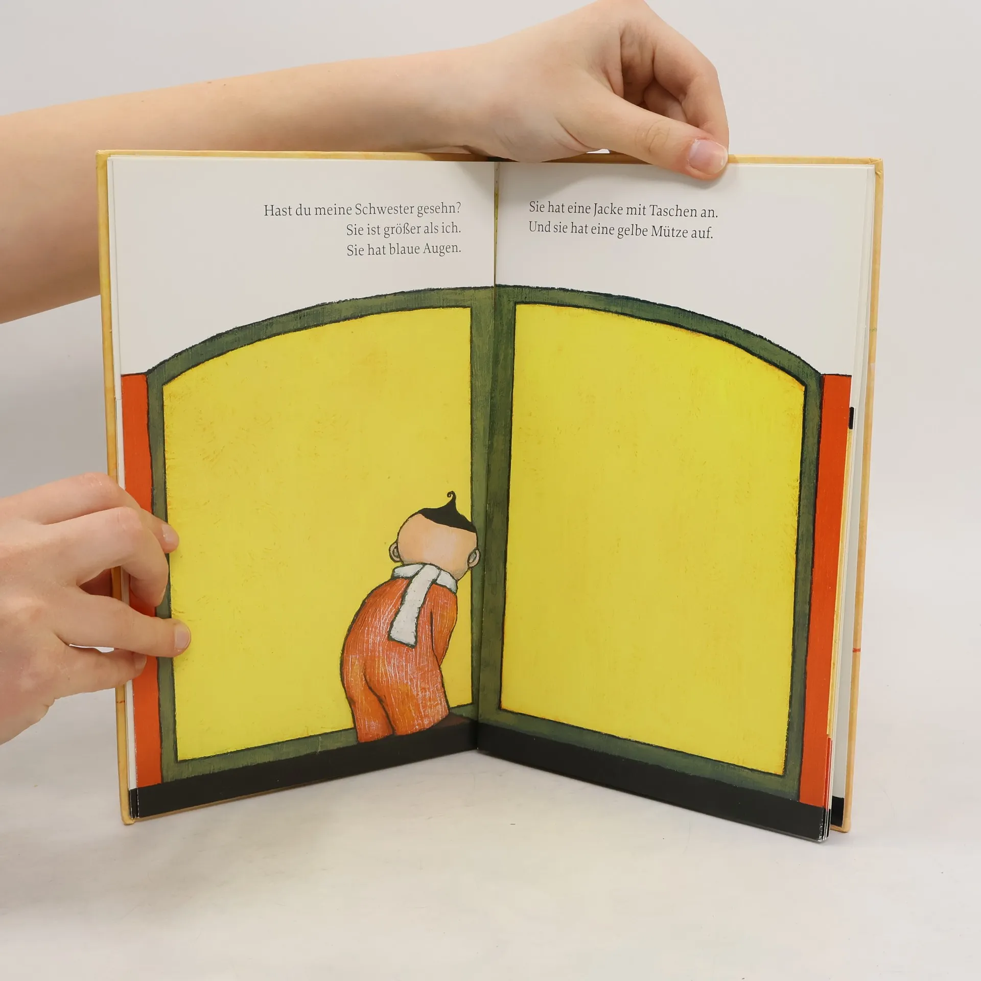 »Hast du meine Schwester gesehn? Sie ist größer als ich. Und sie hat blaue Augen.« Ein kleiner Junge sucht seine große Schwester. Er weiß genau, wie sie aussieht und was sie anhat. Er nimmt uns mit auf seine Suche und fragt jeden, der ihm begegnet. Aber halt! Ist das wirklich ein Hund hinter dieser Mauer dort? Oder etwa ein grüner Drache? Hinter jeder Seite dieses Buches verbirgt sich etwas ganz anderes, als wir zunächst zu sehen glauben. Schließlich findet der kleine Junge seine Schwester, aber nur mit der Hilfe des Betrachters! Ein Klappbilderbuch voller Überraschungen, mit farbenfrohen, expressiven Bildern von Joke van Leeuwen, das einlädt zum Raten und Suchen.