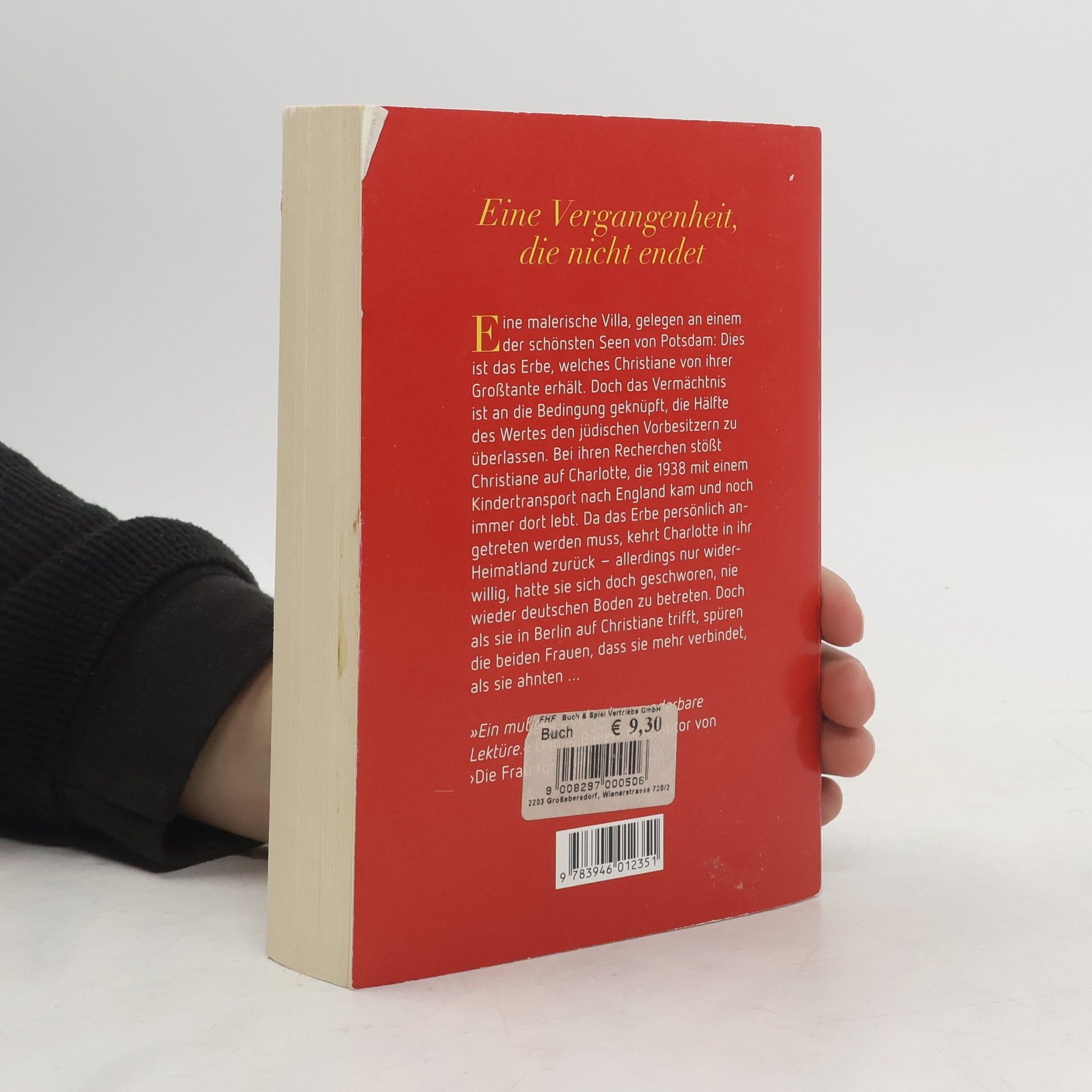 Eine malerische Villa, gelegen an einem der schönsten Seen von Potsdam: Dies ist das Erbe, welches Christiane von ihrer Großtante erhält. Doch das Vermächtnis ist an die Bedingung geknüpft, die Hälfte des Wertes den jüdischen Vorbesitzern zu überlassen. Bei ihren Recherchen stößt Christiane auf Charlotte, die 1938 mit einem Kindertransport nach England kam und noch immer dort lebt. Da das Erbe persönlich angetreten werden muss, kehrt Charlotte in ihr Heimatland zurück – allerdings nur widerwillig, hatte sie sich doch geschworen, nie wieder deutschen Boden zu betreten. Doch als sie in Berlin auf Christiane trifft, spüren die beiden Frauen, dass sie mehr verbindet, als sie ahnten … „Ein mutiges Buch, eine wunderbare Lektüre.“ Daniel Bielenstein, Autor von ‚Die Frau fürs Leben‘