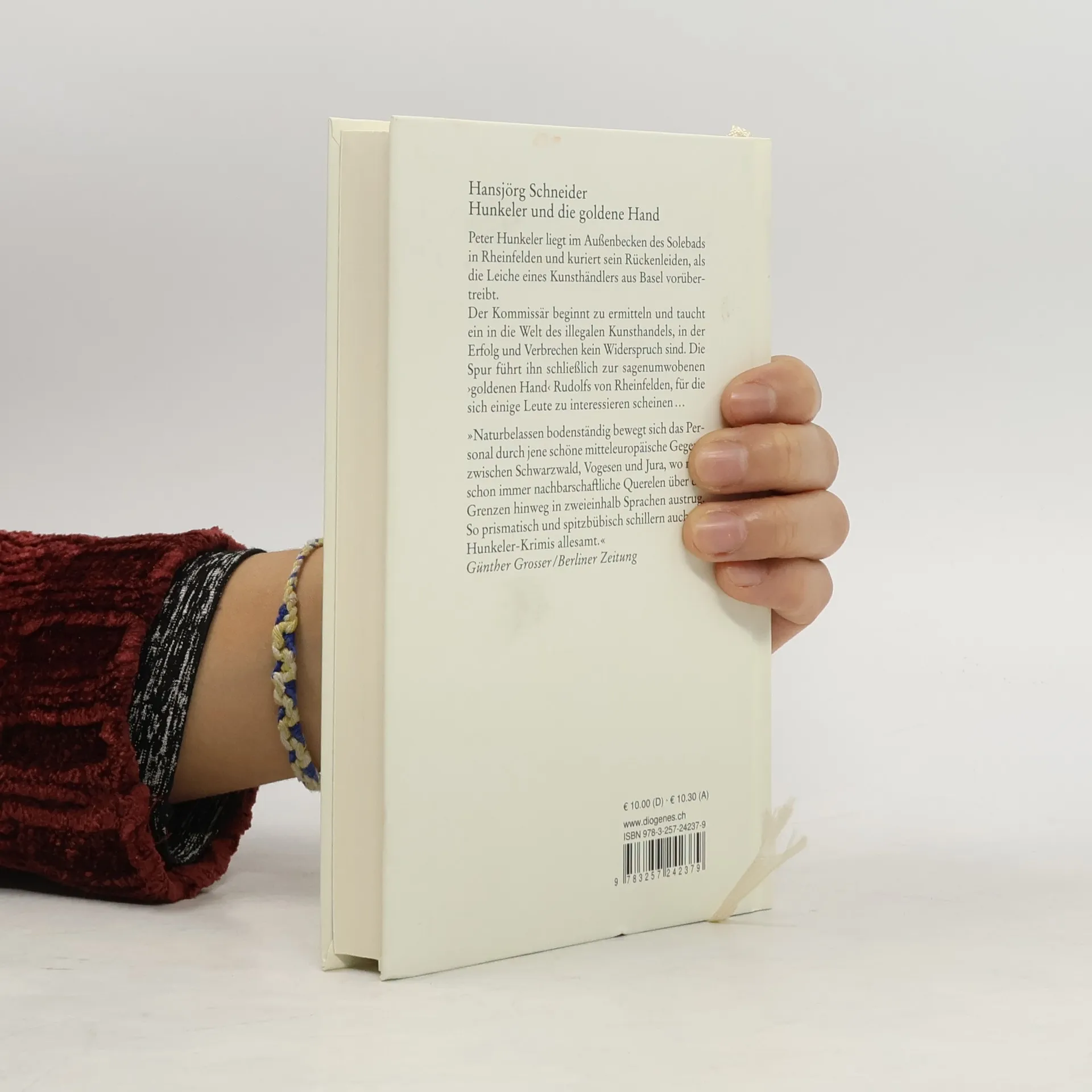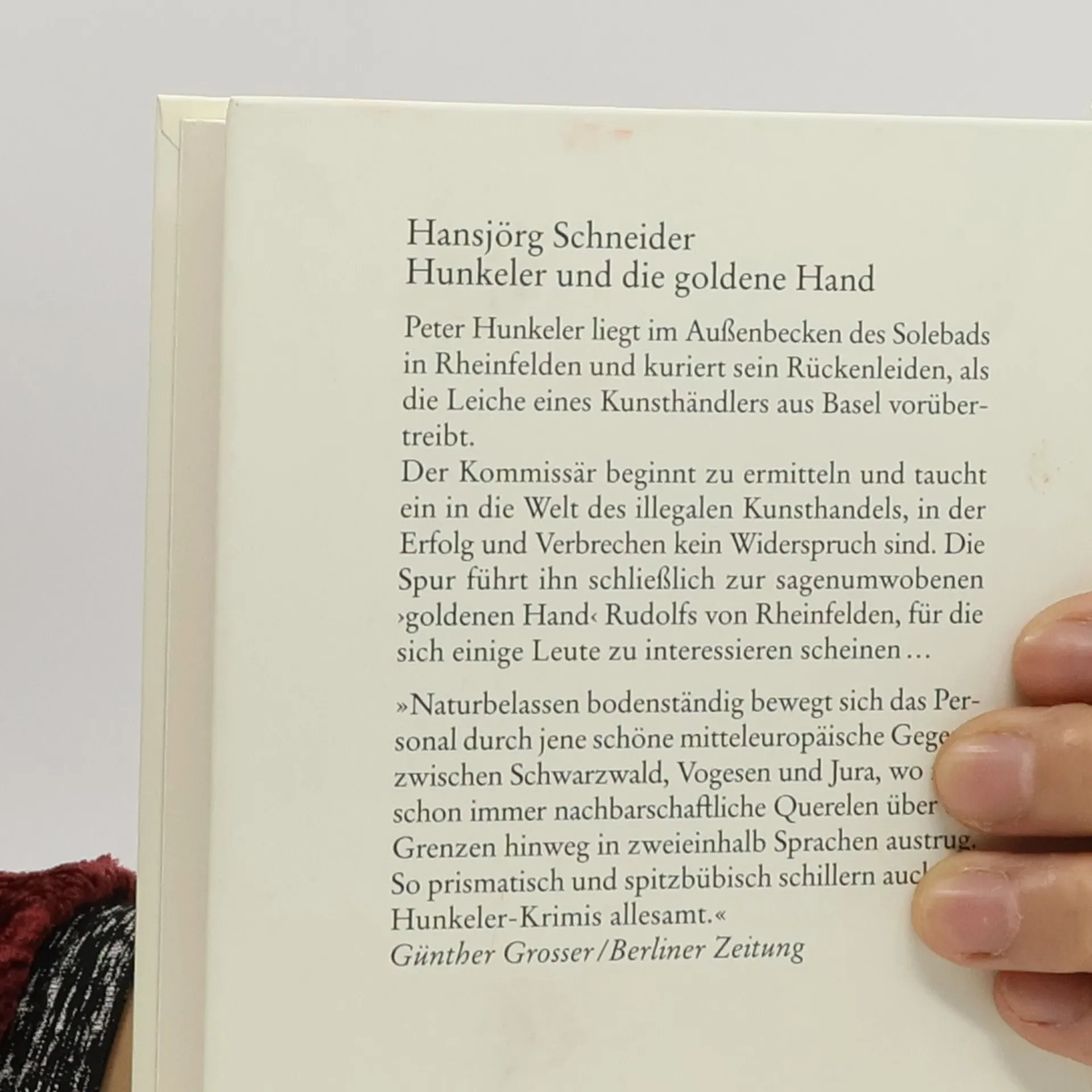 Peter Hunkeler liegt im Außenbecken des Solebads in Rheinfelden und kuriert sein Rückenleiden, als die Leiche eines Kunsthändlers aus Basel vorübertreibt. Der Kommissär beginnt zu ermitteln und taucht ein in die Welt des illegalen Kunsthandels, in der Erfolg und Verbrechen kein Widerspruch sind. Die Spur führt ihn schließlich zur sagenumwobenen ›goldenen Hand‹ Rudolfs von Rheinfelden, für die sich einige Leute zu interessieren scheinen …