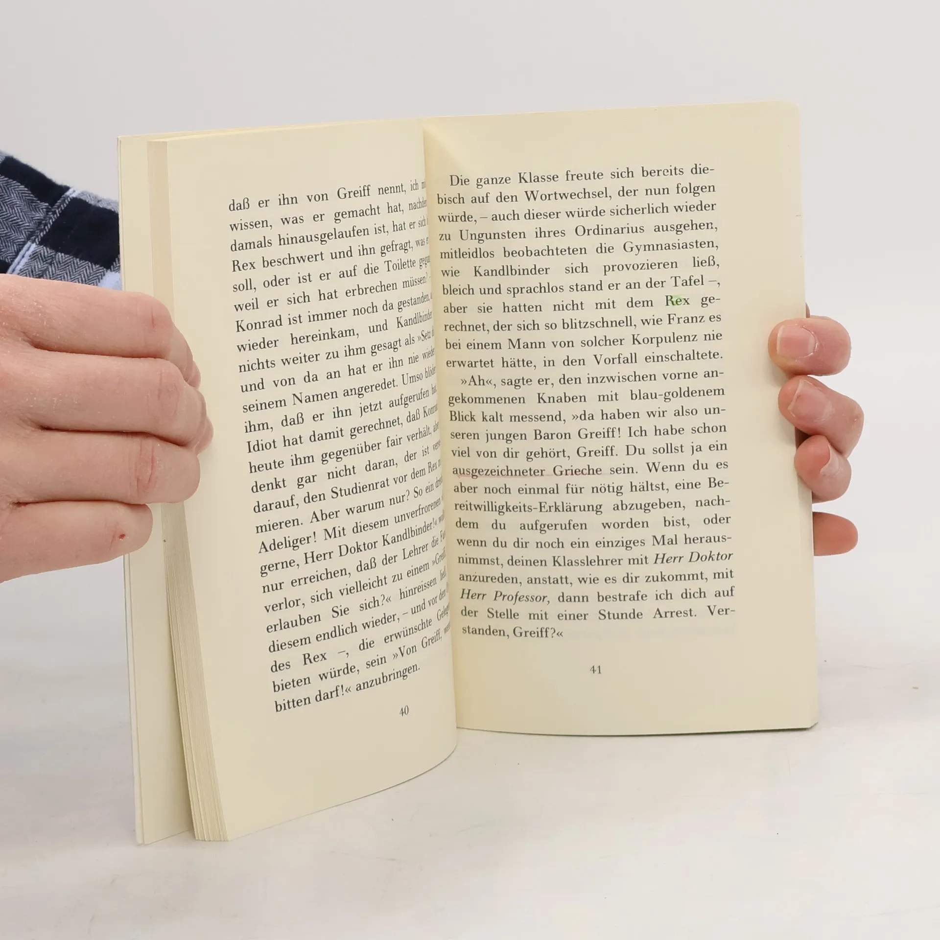 Der vierzehnjährige Franz Kien beschreibt eine Griechischstunde im Mai 1928. Schuldirektor Himmler kommt, um die Klasse zu inspizieren. Bald wird jedoch klar, daß er vorhat, ganz bestimmte Schüler zu examinieren. Nach dem Adligen Konrad von Greiff ist Franz Kien selbst an der Reihe. Der Schuldirektor unternimmt alles, um ihn zu blamieren.