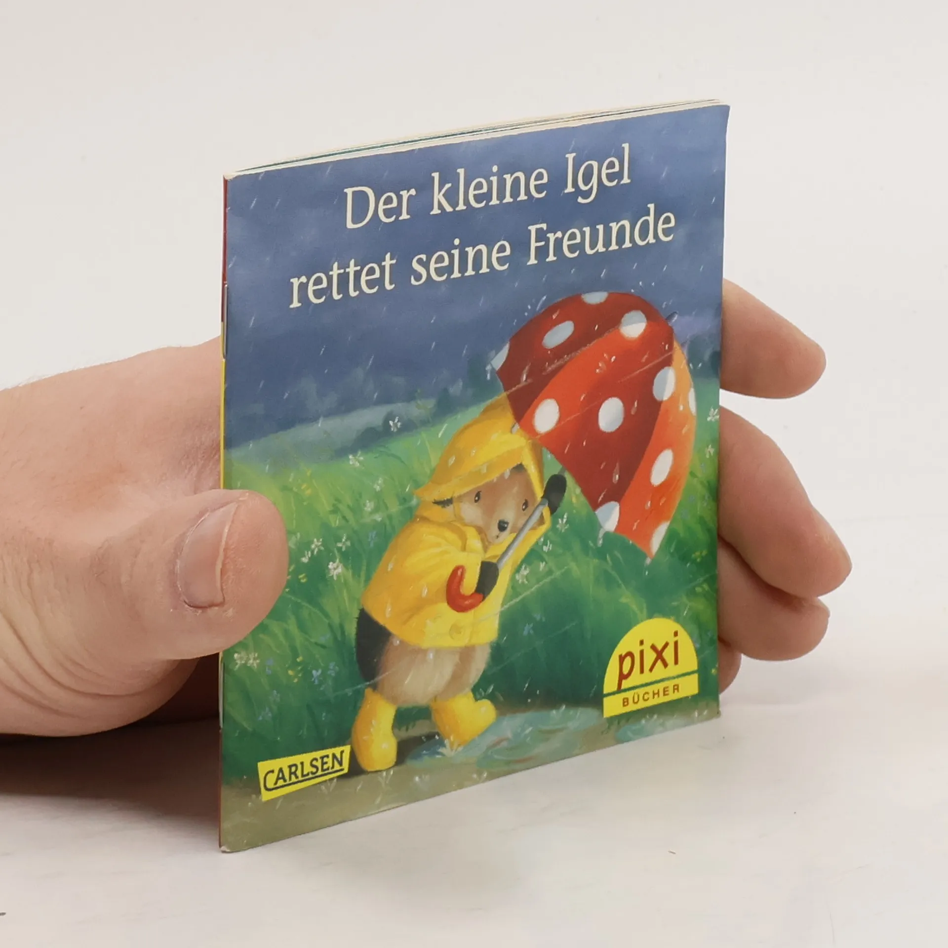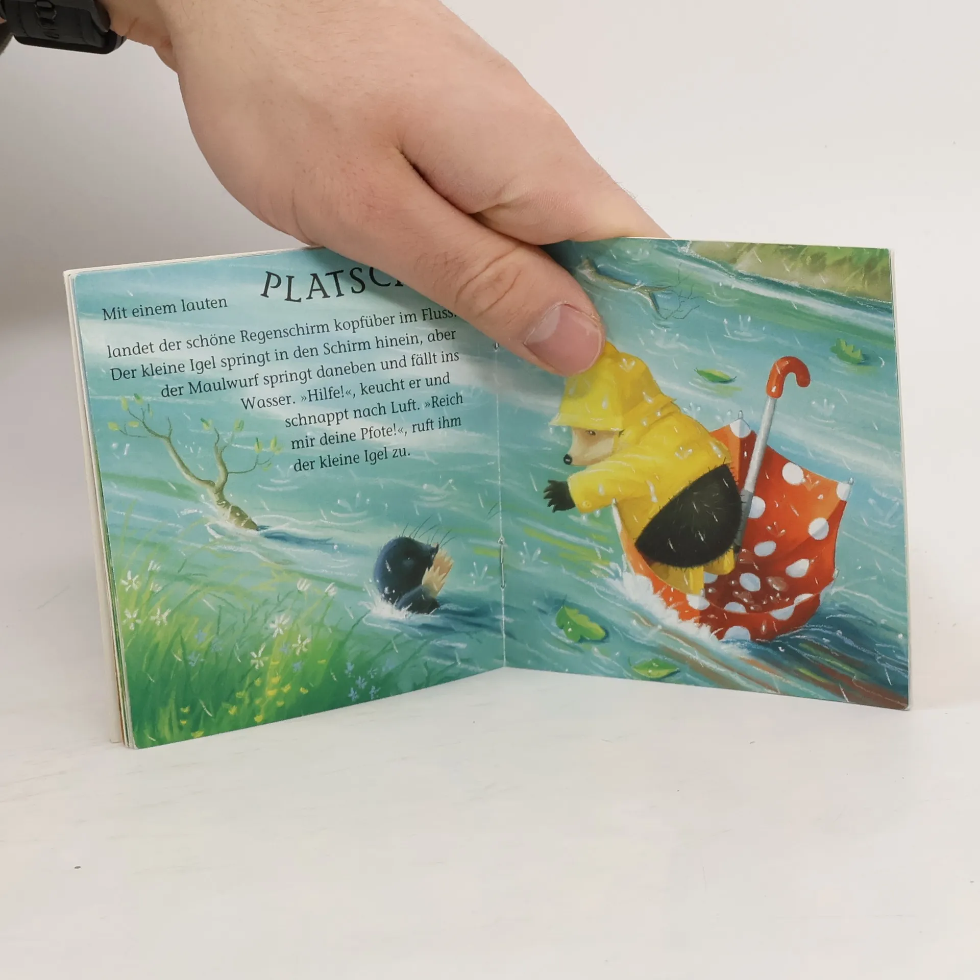 Endlich Regen: Es regnet stark. Der kleine Igel freut sich, denn nun kann er endlich seinen neuen gepunkteten, glitzernden Schirm und die leuchtendgelbe Regengarnitur gebrauchen. Ganz begeistert watet er durch die grösste Pfütze und lauscht dem Regen, der auf seinen Schirm trommelt. Da trifft er auf den kleinen, klatschnassen Maulwurf. Mitleidig reicht er ihm seinen Schirm. Doch plötzlich erfasst den kleinen Maulwurf eine Windböe und hebt ihn samt Schirm in die Höhe. Gerade rechtzeitig kann ihn der kleine Igel an der Hinterpfote festhalten und retten. Ein neuer Windstoss wirbelt nun beide durch die Luft, und schliesslich landen sie im Wasser. Nun dient der Regenschirm als Boot, und so gelangen die beiden durchnässten Freunde an Land, doch nicht ohne vorher noch eine ganze Mäusefamilie vor dem Ertrinken zu retten. Schliesslich können sich alle in der Dachshöhle bei einer Tasse Kakao erholen. Die niedlichen Bilder mit einzigartig echt wirkenden Applikationen bereichern diese liebevoll erzählte "Fühl doch mal"--Geschichte, die Kindern verdeutlichen, wie beglückend Freundschafts- und Liebesdienste sind. Ab 4 Jahren, *****, Silvia Zanetti.