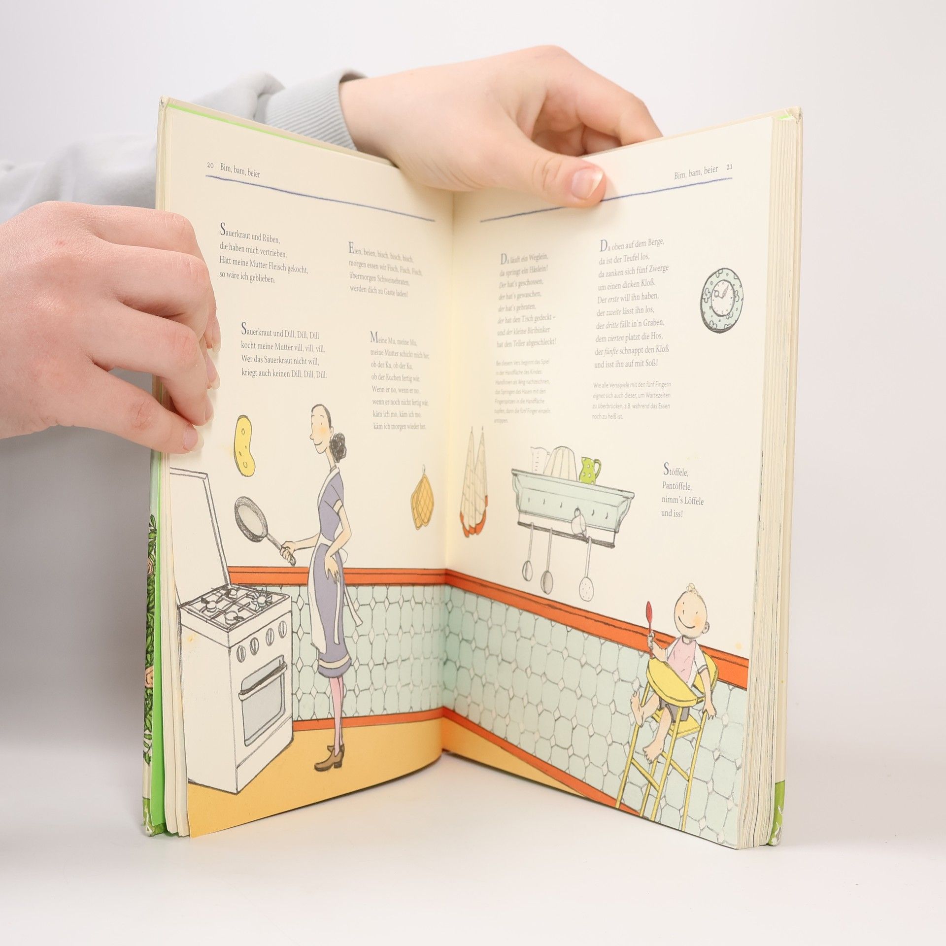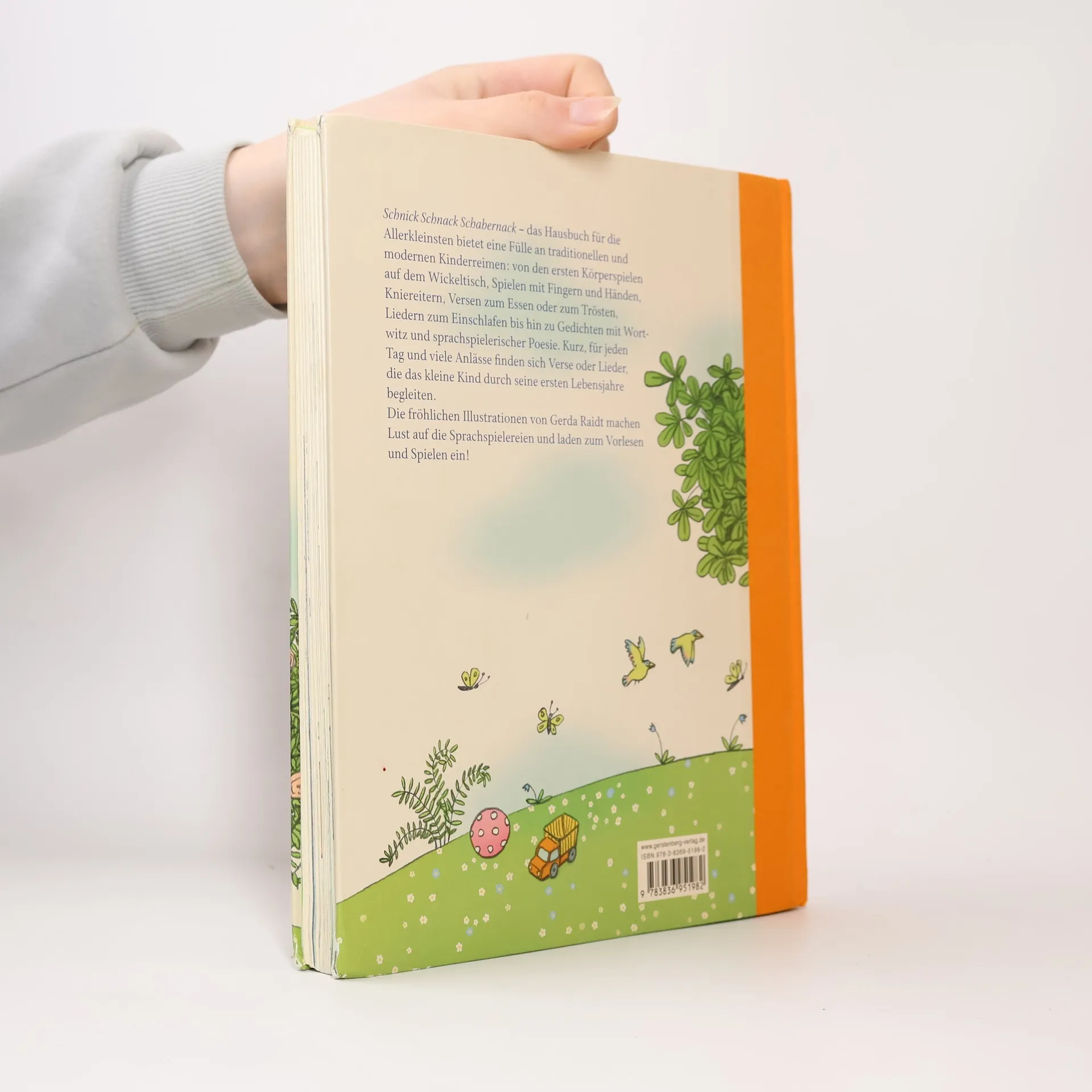 Schon der Säugling auf dem Wickeltisch ist empfänglich für Reime und Lieder. Und die Entwicklungspsychologie bestätigt, wie wichtig die Sprachförderung gerade in den ersten Lebensjahren ist. Dieses Hausbuch für die Allerkleinsten bietet eine Fülle an traditionellen und modernen Kinderreimen: von den ersten Körperspielen auf dem Wickeltisch, Spielen mit Fingern und Händen, Kniereitern, Versen zum Essen oder zum Trösten, Liedern zum Einschlafen bis hin zu Gedichten mit Wortwitz und sprachspielerischer Poesie. Kurz, für jeden Tag und viele Anlässe finden sich Verse und Lieder, die das kleine Kind durch seine ersten Lebensjahre begleiten. Gerda Raidts fröhliche und humorvolle Illustrationen machen Lust auf die Sprachspielereien und das Buch zu einem perfekten Geschenk für Eltern und solche, die es werden wollen.
