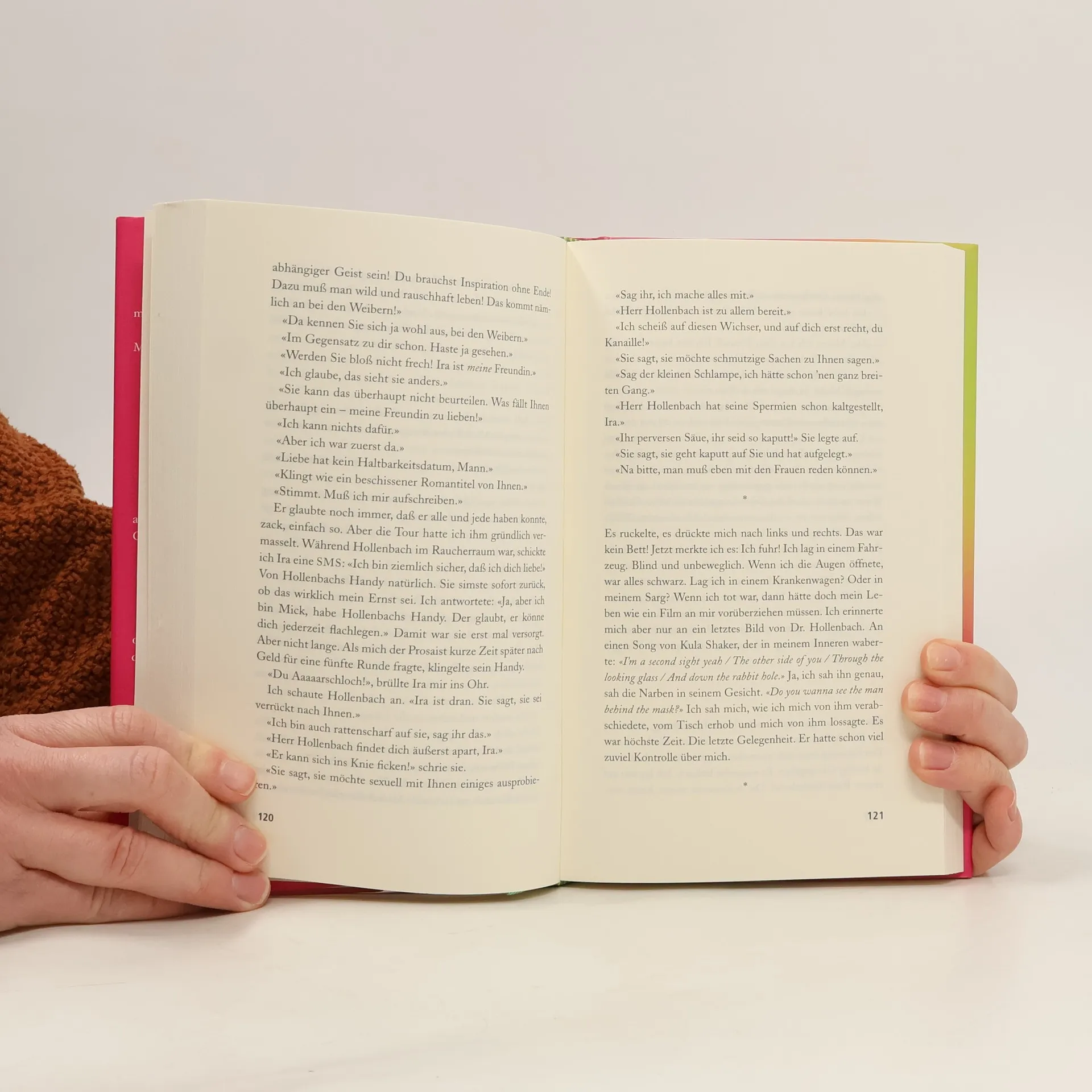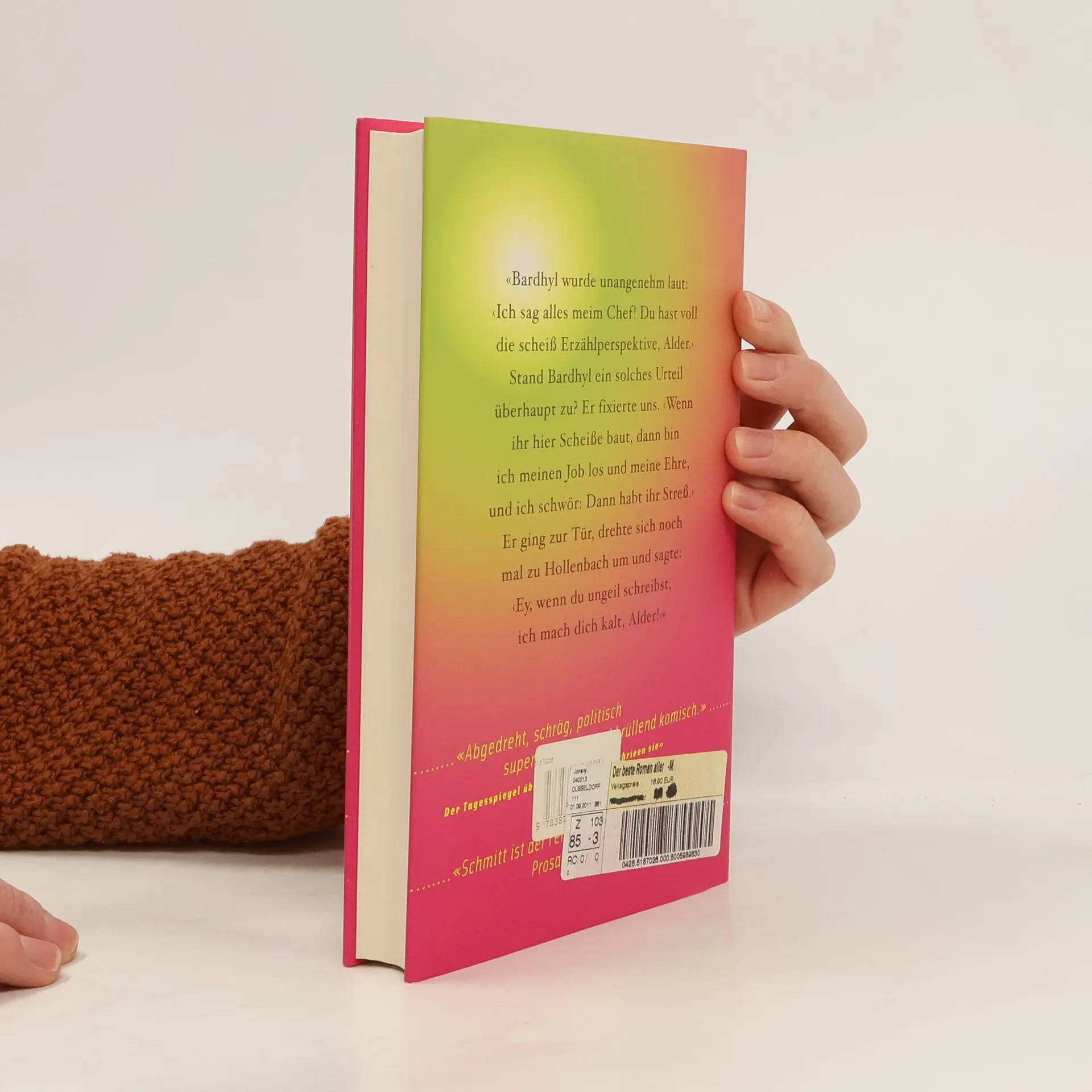 «Bardhyl wurde uangenehm laut: ‹Ich sag alles meim Chef! Du hast voll die scheiß Erzählperspektive, Alder.›Stand Bardhyl ein solches Urteil überhaupt zu? Er fixierte uns. ‹Wenn ihr hier Scheiße baut, dann bin ich meinen Job los und meine Ehre, und ich schwör: Dann habt ihr Streß.›Er ging zur Tür, drehte sich noch mal zu Hollenbach um und sagte: ‹Ey, wenn du ungeil schreibst, ich mach dich kalt, Alder!›»