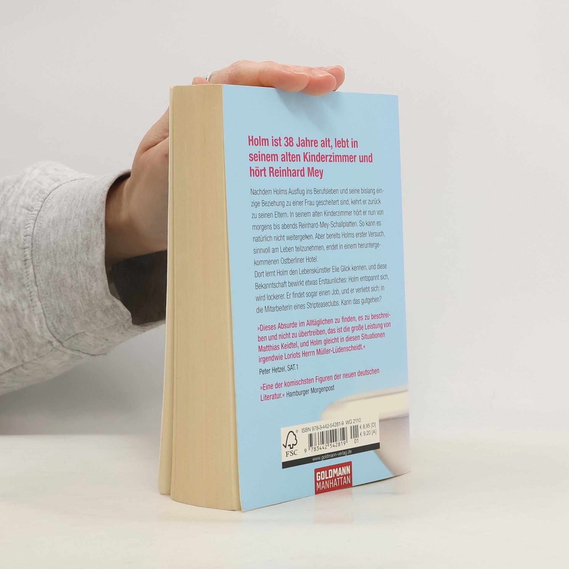 Holm ist 38 Jahre alt, lebt in seinem alten Kinderzimmer und hört Reinhard Mey – der liebenswerteste Loser Berlins Nachdem Holms Ausflug ins Berufsleben und seine bislang einzige Beziehung zu einer Frau gescheitert sind, kehrt er zurück zu seinen Eltern. In seinem alten Kinderzimmer hört er den ganzen Tag Reinhard Mey. So kann es nicht weitergehen. Aber bereits sein erster Versuch, sinnvoll am Leben teilzunehmen, endet in einem schäbigen Ostberliner Hotel. Dort lernt Holm den Lebenskünstler Elie Glick kennen, und diese Bekanntschaft bewirkt Erstaunliches: Holm entspannt sich, und er verliebt sich: in die Mitarbeiterin eines Stripteaseclubs. Kann das gutgehen? Eine glänzende Komödie über die Absurdität des Lebens und des modernen Mannes.
