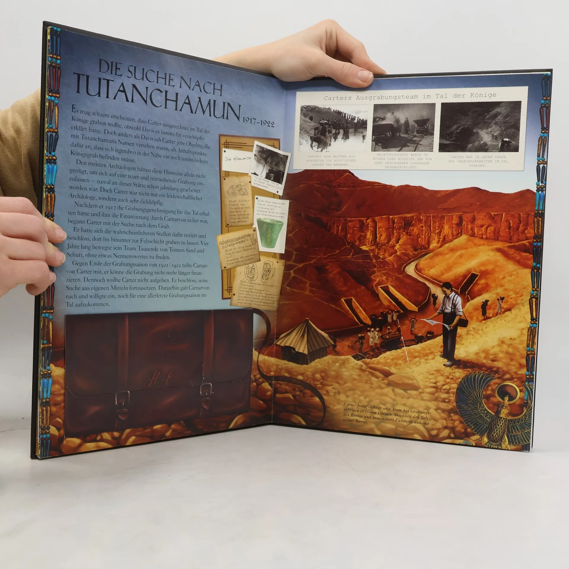 Die Geheimnisse des Tutanchamun – Das große interaktive Sachbuch. Ägypten 1922: Der Archäologe Howard Carter macht im Tal der Könige eine sensationelle Entdeckung – das Grab Tutanchamuns! Über 3000 Jahre ist es unentdeckt geblieben, doch nun befördern die Ausgrabungsarbeiten einen der aufsehenerregendsten Funde aller Zeiten ans Tageslicht: die Mumie des Pharaos und seinen prachtvollen Grabschatz. Mithilfe von Ausgrabungskarten, Originaldokumenten und einem Wörterbuch der archäologischen Fachbegriffe können alle Ägypten-Fans das Geheimnis des Tutanchamun selbst erforschen. Eine 3D-Darstellung der Grabkammer und spektakuläre Pop-ups laden auf eine atemberaubende Reise ins alte Königreich Ägypten ein. • Eine spannende Reise ins alte Ägypten • Mit Ausgrabungskarten, Originaldokumenten und einem Wörterbuch der archäologischen Fachbegriffe • Mit dreidimensionaler Grabkammer und spektakulären Pop-ups von der Totenmaske des Pharao
