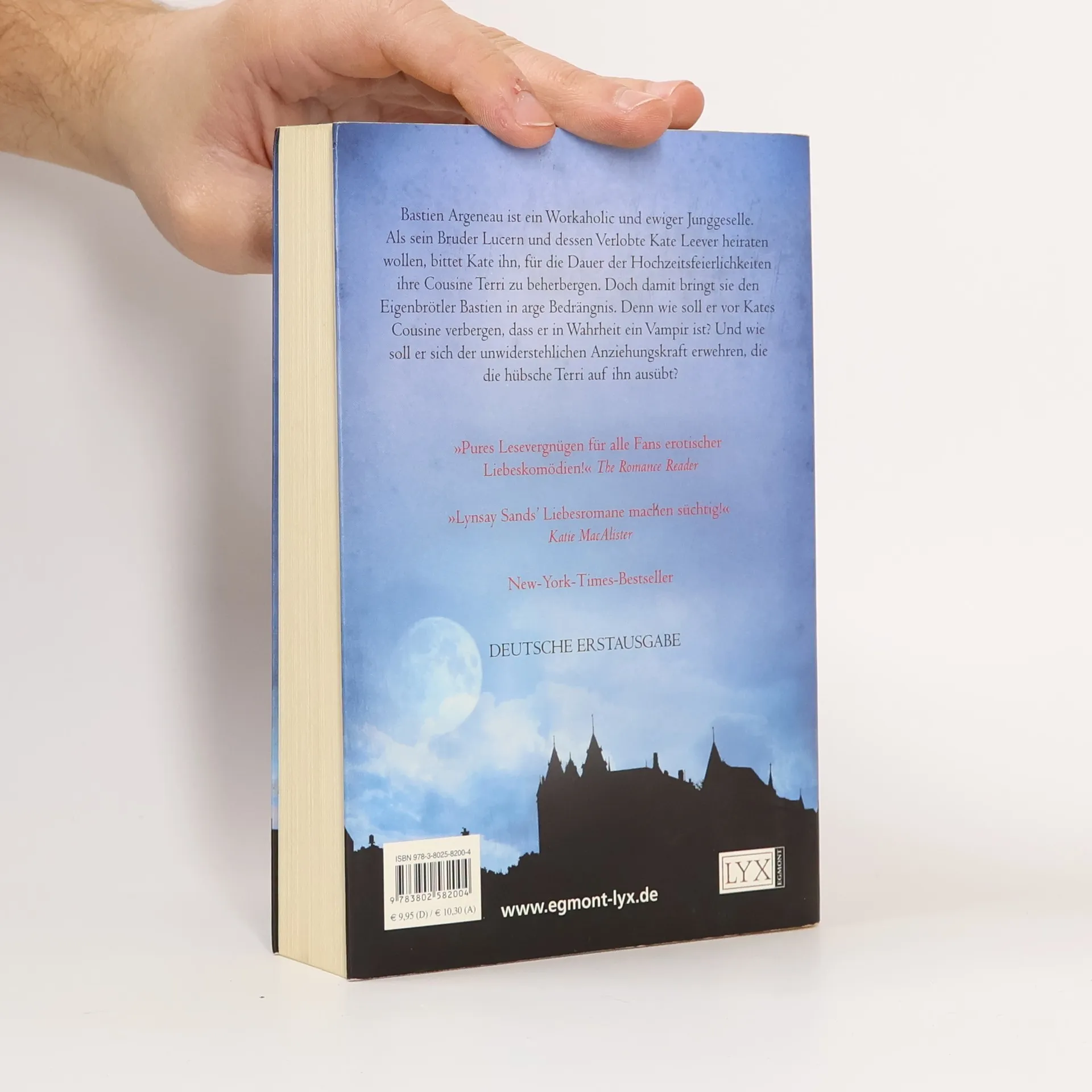 Als ewiger Junggeselle genießt Bastien Argeneau seine Freiheit. Besonders seit sein Bruder Lucern mit seiner Verlobten Kate Leever zusammengezogen ist und er das Penthouse der Familie ganz für sich allein hat. Als Kate ihn bittet, für die Dauer der Hochzeit ihre Cousine Terri zu beherbergen, gerät der Eigenbrötler Bastien jedoch in Bedrängnis. Wie soll er vor Kates Cousine verbergen, dass er in Wahrheit ein Vampir ist? Und noch entscheidender: Wie kann er sich der unwiderstehlichen Anziehungskraft erwehren, die die hübsche Terri auf ihn ausübt? „Eine witzige, verrückte Geschichte ... Leserinnen von Vampirromanen werden sich vor Lachen kaum halten können. Und die Liebesszenen sind ein erotischer Hochgenuss!“ Publishers Weekly