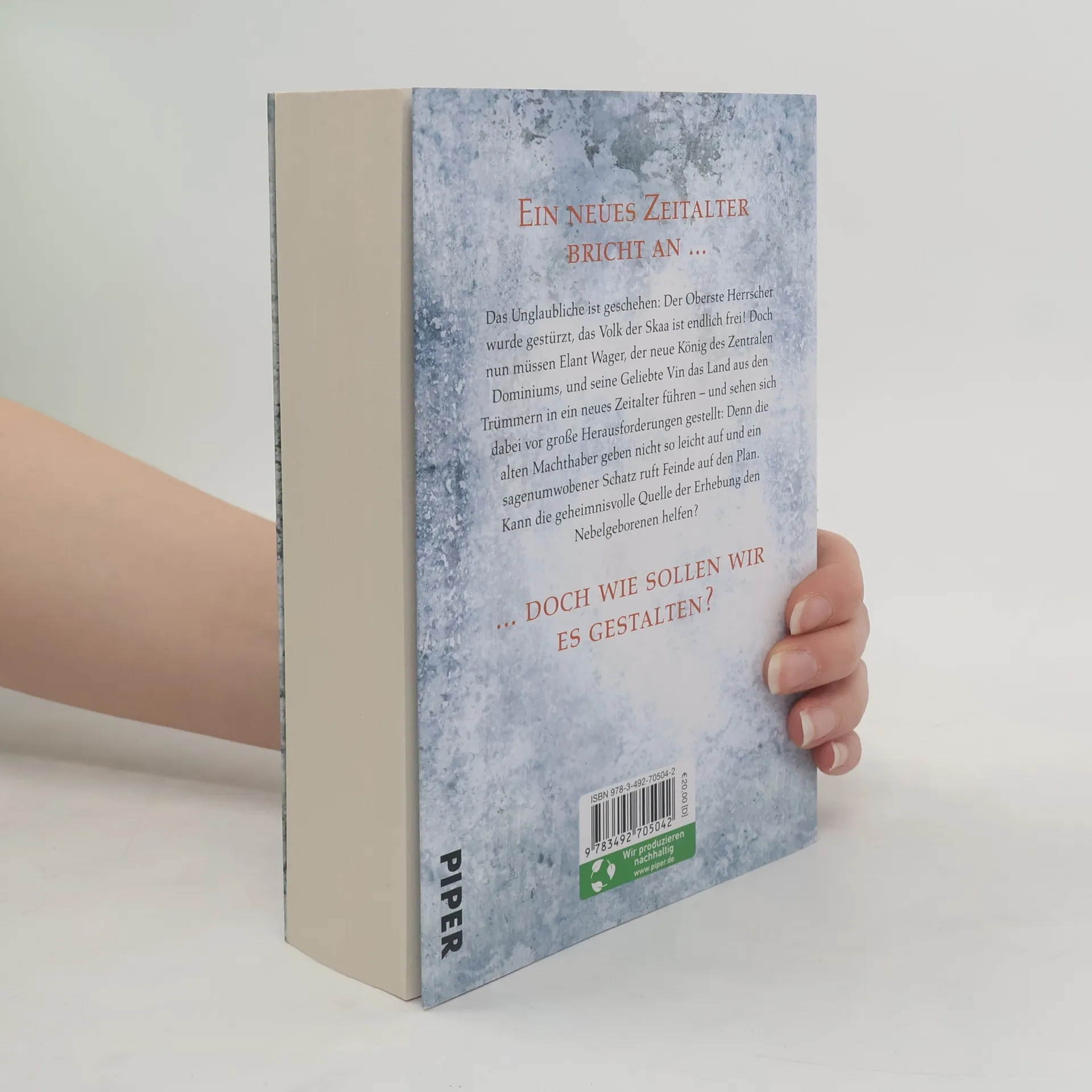 Dem Rebellenanführer Kelsier und seiner Armee von Nebelgeborenen ist es gelungen, endlich den tyrannischen Obersten Herrscher zu stürzen! Eine Jahrtausende währende Ära der Unterdrückung geht damit zu Ende, das Volk der Skaa ist endlich frei. Doch wie geht es weiter, wenn der Feind besiegt ist? Vin und ihr Geliebter Elant Wager, der neue König des Zentralen Dominiums, müssen nun das Land aus den Trümmern in ein neues Zeitalter führen – und sehen sich dabei vor große Herausforderungen gestellt: Denn die alten Machthaber geben nicht so einfach auf und ein sagenumwobener Schatz ruft feindliche Armeen auf den Plan. Kann die geheimnisvolle Quelle der Erhebung den Nebelgeborenen helfen? Weitere Bände der Reihe: Erstes Zeitalter der Nebelgeborenen: Kinder des Nebels (Band 1) Krieger des Feuers (Band 2) Held aller Zeiten (Band 3) Zweites Zeitalter der Nebelgeborenen (»Wax & Wayne«-Reihe): Hüter des Gesetzes (Band 4) (vormals erschienen als: Jäger der Macht) Schatten über Elantel (Band 5) Bänder der Trauer (Band 6) Metall der Götter (Band 7)