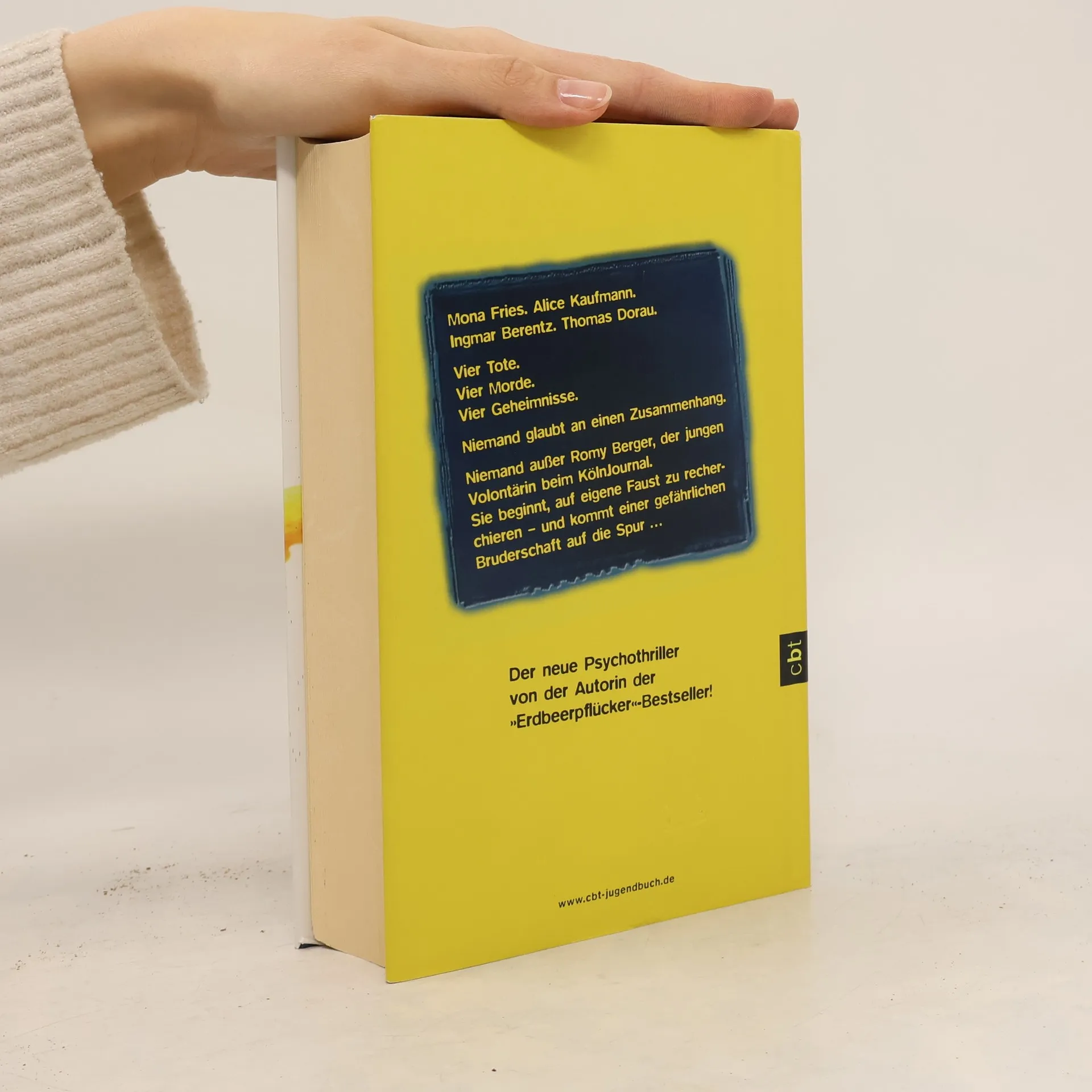 Die achtzehnjährige Romy hat ihren Traumjob als Volontärin bei einer Kölner Zeitung ergattert. Als die Leiche eines jungen Mannes aus einem See geborgen wird und kurz darauf ein stark abgemagertes Mädchen gefunden wird, glaubt niemand an einen Zusammenhang zu drei anderen Mordfällen der letzten Monate – außer Romy und dem neu versetzten Kommissar Bert Melzig. Romy, die Tochter von Aussteigereltern, lebt in einem Szenehaus in der Kölner Südstadt und hat sich ihren Platz beim „KölnJournal“ erkämpft, wo ihr Chef viel von ihr hält. Die unterschiedlichen DNA-Spuren der beiden neuen Todesfälle lassen die Ermittler glauben, dass sie nicht mit den früheren Morden verbunden sind. Vier Kommissare sind mit den Fällen betraut, wobei Melzig für den vierten zuständig ist. Doch Romy hat ein Gespür dafür, dass es einen Zusammenhang gibt. Sie überzeugt ihren Chef, Nachforschungen für die Zeitung anstellen zu dürfen, und stößt dabei auf eine gefährliche Bruderschaft. Der Psychothriller ist brillant erzählt, atemberaubend spannend und bietet eine dichte Atmosphäre mit faszinierenden Figuren.