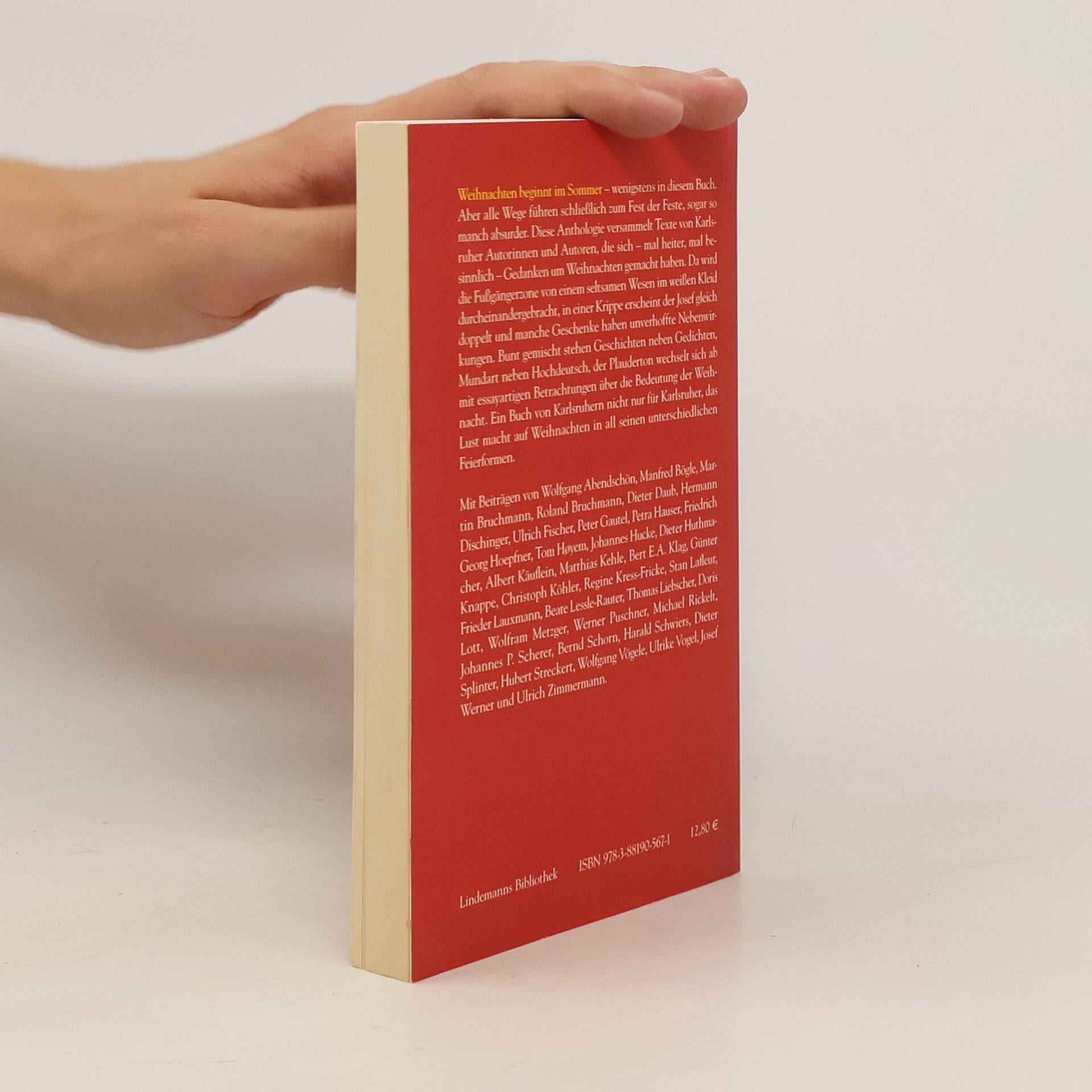 Weihnachten beginnt im Sommer – wenigstens in diesem Buch. Aber alle Wege führen schließlich zum Fest der Feste, sogar so manch absurder. Diese Anthologie versammelt Texte von Karlsruher Autorinnen und Autoren, die sich – mal heiter, mal besinnlich – Gedanken um Weihnachten gemacht haben. Da wird die Fußgängerzone von einem seltsamen Wesen im weißen Kleid durcheinander gebracht, in einer Krippe erscheint der Josef gleich doppelt und manche Geschenke haben unverhoffte Nebenwirkungen. Bunt gemischt stehen Geschichten neben Gedichten, Mundart neben Hochdeutsch, der Plauderton wechselt sich ab mit essayartigen Betrachtungen über die Bedeutung der Weihnacht. Ein Buch von Karlsruhern nicht nur für Karlsruher, das Lust macht auf Weihnachten in all seinen unterschiedlichen Feierformen. Mit Beiträgen von Wolfgang Abendschön, Manfred Bögle, Martin Bruchmann, Roland Bruchmann, Dieter Daub, Hermann Dischinger, Ulrich Fischer, Peter Gautel, Petra Hauser, Friedrich Georg Hoepfner, Tom Høyem, Johannes Hucke, Dieter Huthmacher, Albert Käuflein, Matthias Kehle, Bert E. A. Klag, Günter Knappe, Christoph Köhler, Regine Kress-Fricke, Stan Lafleur, Frieder Lauxmann, Beate Lessle-Rauter, Thomas Liebscher, Doris Lott, Wolfram Metzger, Werner Puschner, Michael Rickelt, Johannes P. Scherer, Bernd Schorn, Harald Schwiers, Dieter Splinter, Hubert Streckert, Wolfgang Vögele, Ulrike Vogel, Josef Werner und Ulrich Zimmermann.