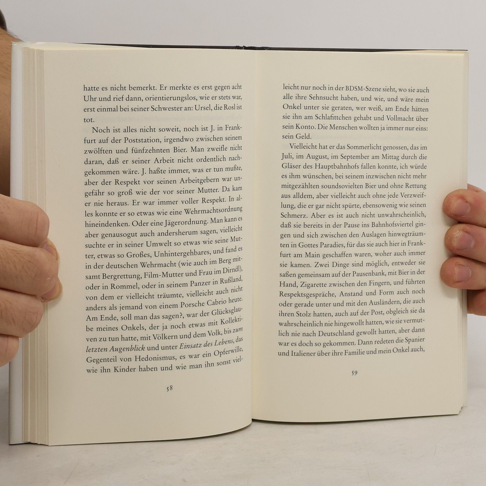 Mit einem Bein steht er noch im Paradies, dafür hat die Geburtszange gesorgt. Immer ist er ein Kind geblieben, und wurde doch stets älter, und leben mußte er auch irgendwie. Nun ist er schon dreißig und hat seine große Liebe, einen VW-Variant Typ 3, mit dem fährt er zwischen den blühenden Rapsfeldern umher. Es ist das Jahr der ersten Mondlandung, 1969, als man in Frankfurt am Main noch Treppensteigen geht in den Bordellaltbauten um den Bahnhof herum. Ein Tag im Leben Onkel J. s. Hin- und hergerissen zwischen Luis Trenker, der Begeisterung für Wehrmachtspanzer und den Frankfurter Nutten, wird J. plötzlich als ein Mensch erkennbar, der außerhalb jeden Schuldzusammenhangs steht, noch in den zweifelhaftesten Augenblicken. Einer, der nicht zugreift, weil er es gar nicht kann, während die Welt um ihn herum sich auf eine heillose Zukunft wie auf die Erlösung vorbereitet. Nach den Romanen „Wäldchestag“, „Klausen“, „Kirillow“, „Sanssouci“ und „Onkel J. Heimatkunde“ setzt Andreas Maier neu an: Das Zimmer ist ein Erinnerungsporträt und Roman zugleich, vielleicht der Beginn einer großen Familiensaga, eine Reflektion über Zeit und Zivilisation, über die Würde des Menschen und wie sie erhalten bleiben kann. „Der begabteste Schwadroneur unter den jüngeren Autoren.“ Ulrich Greiner, Die Zeit