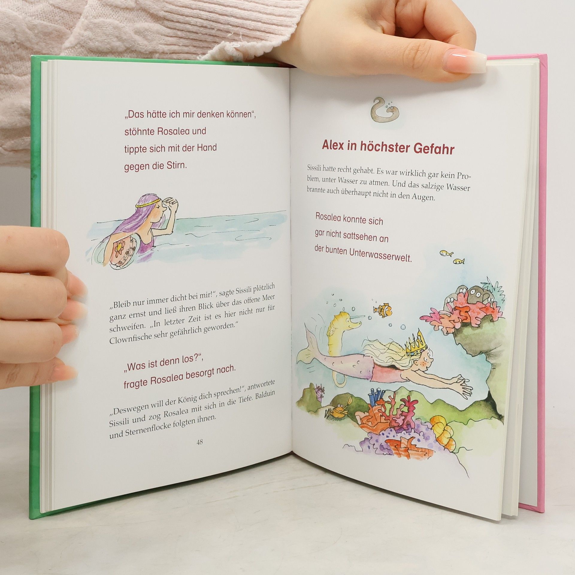 Magie am Meeresboden: Rosalea und Alex, die zwei Kinder der Bäckerfamilie Kardamon, bekommen eines Tages von einer Kundin einen Clownfisch geschenkt. Rosalea bemerkt, dass der Fisch ganz traurig am Boden des Glases liegt und beschliesst, ihn wieder in seine Heimat zurückzubringen. Mit Hilfe ihrer magischen Spieluhr gelangen sie und ihr Bruder in einem Wirbelsturm bis in die Südsee. Dort lassen sie den überglücklichen Balduin, wie der Clownfisch heisst, wieder frei. Als die Kinder in die ihnen fremde Welt eintauchen, werden sie zu Meermädchen und Meerjungen, wie die Kinder des Meerkönigs, dessen Tochter Balduin gehört. Alle schwimmen gemeinsam voller Freude im Meer herum. Da verfängt sich Alex in einem Schleppnetz. Karl, die Krabbe und Siggi, der Sägefisch befreien ihn jedoch wieder. Um die Taucher und die Fischer von ihren Raubfängen abzuhalten, tarnen sich alle Fische gemeinsam als grusliges Monster und verjagen sie mit Erfolg. Der König ist überglücklich und Rosalea und ihr Bruder kehren wieder in ihre Welt zurück. Ideal zum gemeinsamen Lesen durch verschiedene Schriftgrössen. Ab 8 Jahren, ***, Patricia Hacker.