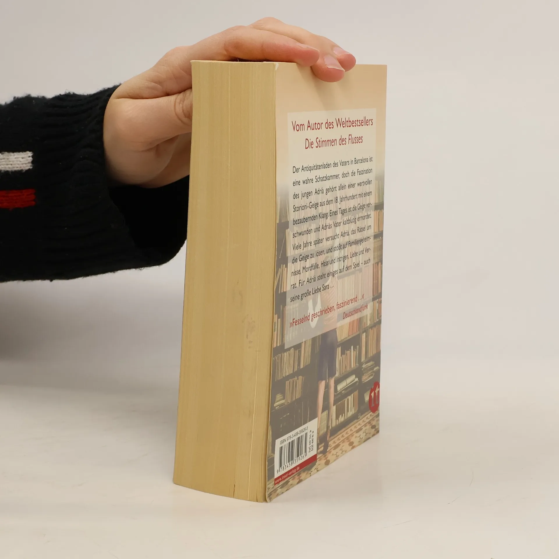 Der Antiquitätenladen des Vaters in Barcelona ist eine wahre Schatzkammer, doch die Faszination des jungen Adrià gehört allein einer wertvollen Storioni-Geige aus dem 18. Jahrhundert mit einem bezaubernden Klang. Heimlich tauscht Adrià sie eines Tages mit seiner eigenen Geige aus, um sie stolz seinem besten Freund zu zeigen. Als er die Storioni zurücklegen möchte, sind seine Geige und sein Vater verschwunden, der Antiquitätenhändler wurde kaltblütig ermordet. Viele Jahre danach – Adrià ist inzwischen Gelehrter und Sammler – sucht er das Rätsel um die Storioni zu lösen und so den wahren Grund für den Mord herauszufinden. Er ahnt nicht, dass die Vergangenheit des Musikinstruments Familiengeheimnisse, Mordfälle, Hass und Intrigen, Liebe und Verrat verbirgt. Für Adrià steht einiges auf dem Spiel – auch seine große Liebe Sara …