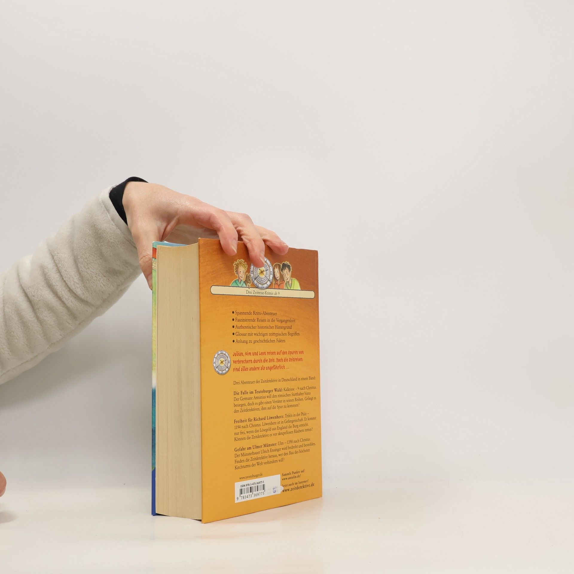 Wie gelingt es dem Germanen Arminius, den römischen Statthalter Varus und seine Legionen im Teutoburger Wald zu besiegen? Welche Gefahren lauern auf Richard Löwenherz, nachdem er gegen ein Lösegeld aus der Gefangenschaft freikommt? Und wer bedroht den Ulmer Münsterbauer Ulrich Ensinger? Drei spannende Fälle für die Zeitdetektive!