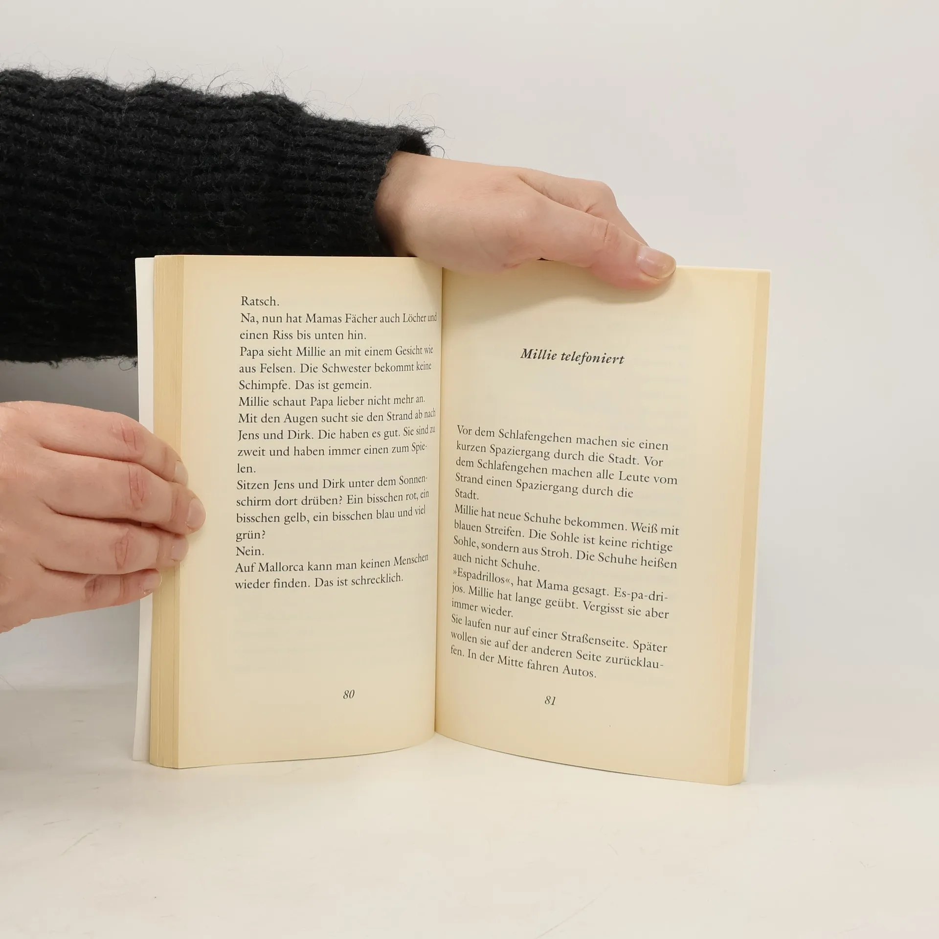 Eigentlich wollte Millie ja an den Amazonas. Aber der ist leider zu weit weg. Also fährt sie mit Mama, Papa und der kleinen Schwester nach Mallorca. Als Erstes lernt Millie schwimmen. Sie braucht nur die Arme und Beine zu bewegen. Pickepacke leicht. Dann besichtigen sie natürlich noch dies und das. Zum Beispiel das Kloster, in dem früher ein Herr Schopängpängpäng Klavier gespielt hat. Und überall auf Mallorca trifft Millie Miss Mandarella, eine wunderschöne Puppe, in Rot mit Rüschen. Das wär doch ein gutes Andenken, oder?