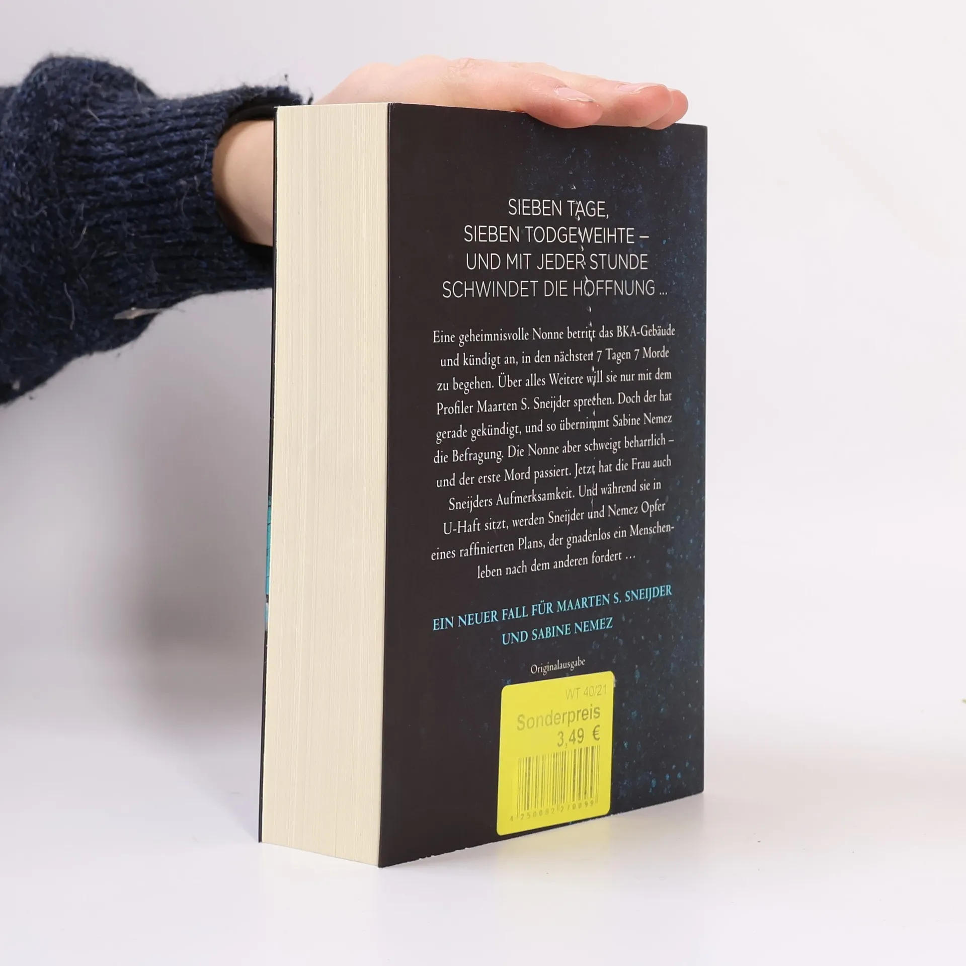 Der neue Thriller des Nr. 1 Spiegel Bestsellerautors. Der neue Fall für Sneijder und Nemez.Eine geheimnisvolle Nonne betritt das BKA-Gebäude in Wiesbaden und kündigt an, in den nächsten 7 Tagen 7 Morde zu begehen. Über alles Weitere will sie nur mit dem Profiler Maarten S. Sneijder sprechen. Doch der hat gerade gekündigt, und so befragt Sneijders Kollegin Sabine Nemez die Nonne. Aber die schweigt beharrlich – und der erste Mord passiert. Jetzt hat sie auch Sneijders Aufmerksamkeit. Und während die Nonne in U-Haft sitzt, werden Sneijder und Nemez Opfer eines raffinierten Plans, der gnadenlos ein Menschleben nach dem anderen fordert und dessen Ursprung in einer grausamen, dunklen Vergangenheit liegt … Der fünfte Fall für Sneijder und Nemez.